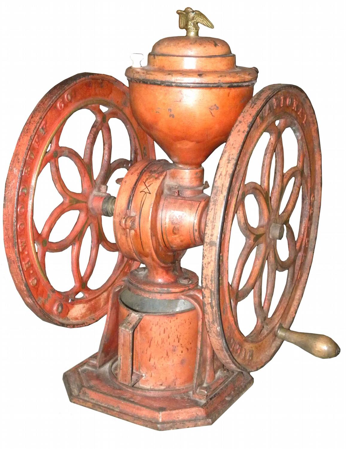 Elgin National Coffee Mill #22. Good original condition. Wheel diameter 16 inches X 24 inches tall.