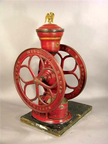 Elgin National Coffee Mill #42, Woodruff and Edwards Co. Elgin, IL. Complete, mounted on wood base. Original paint. Wheel 17 inch diameter X 31 inches tall.