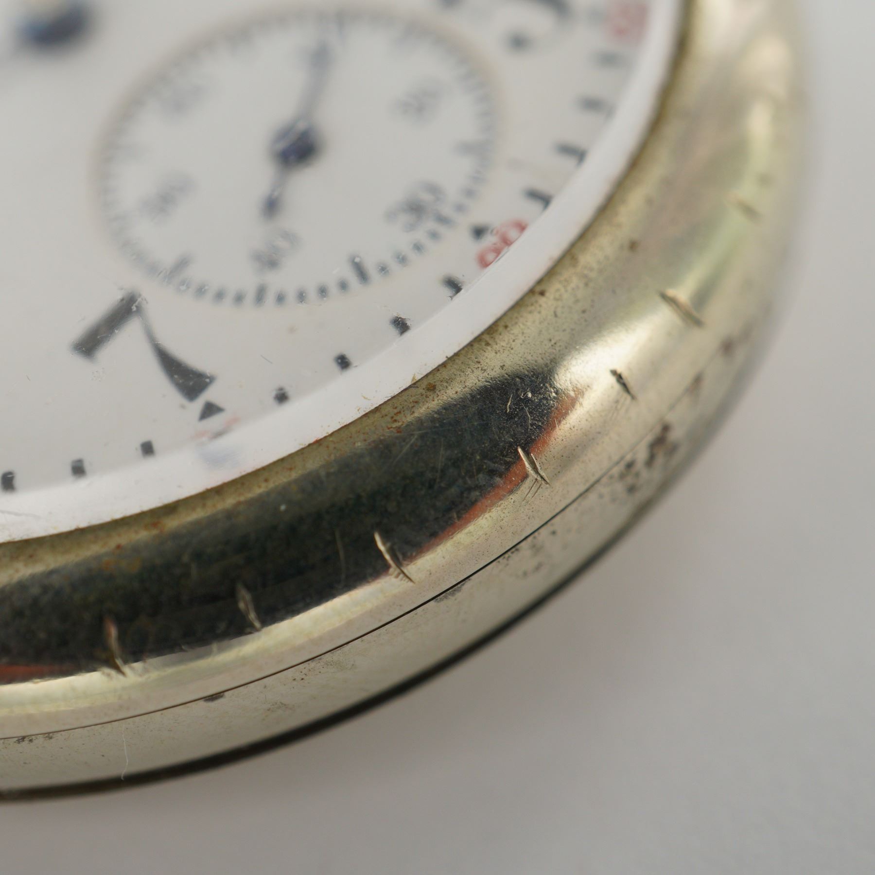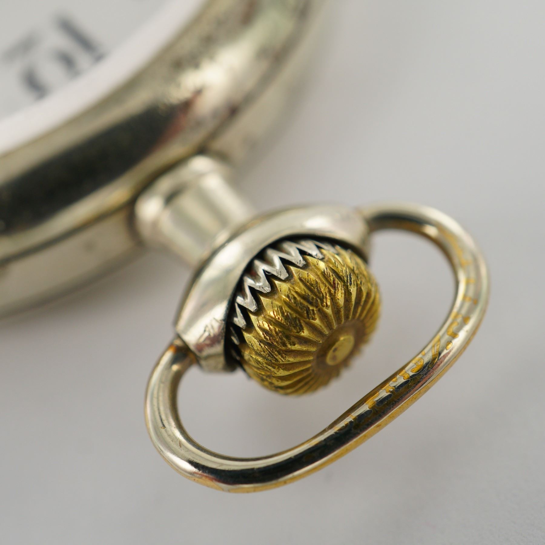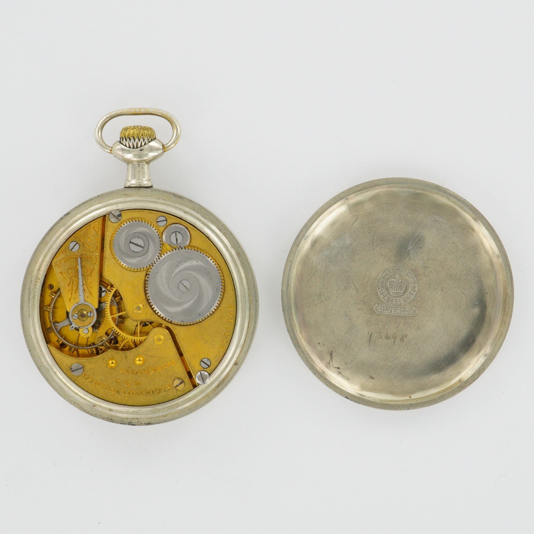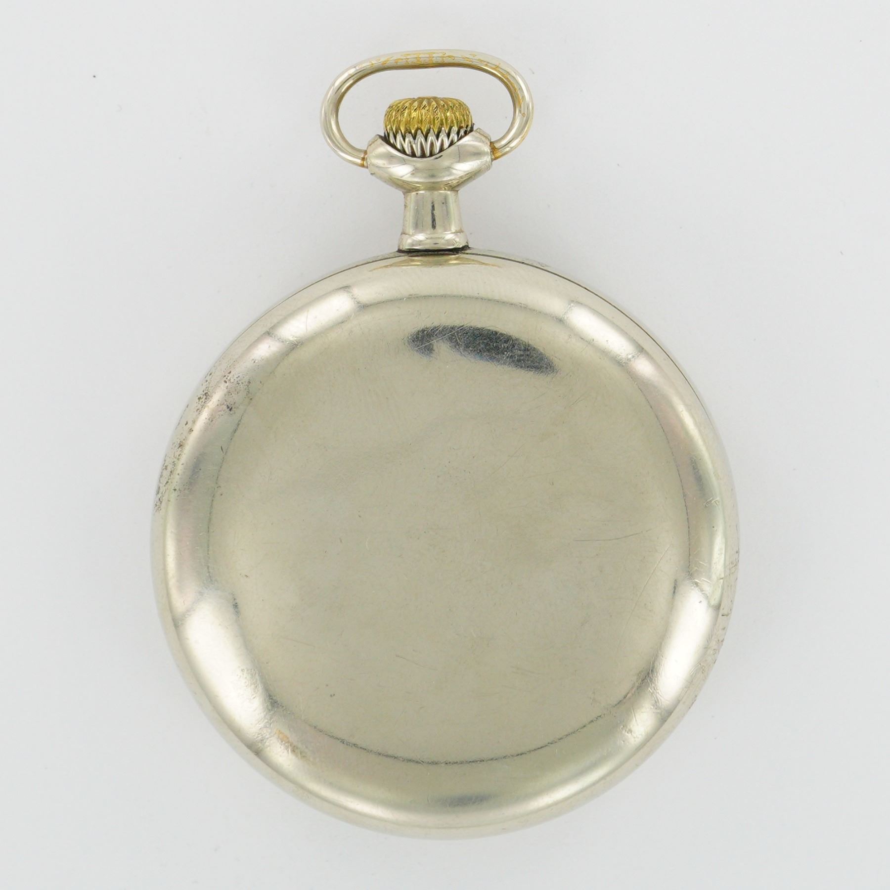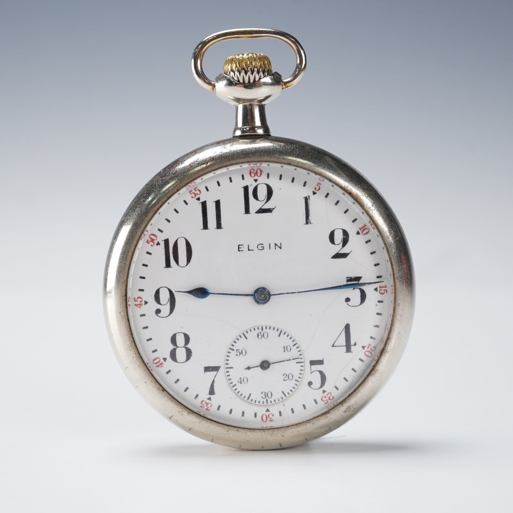 This vintage Elgin National Watch Co. open face pocket watch features a Philadelphia Watch Case Co. Silverode case, serial number 633704, with a smooth back and minimal wear. The white dial is adorned with black Roman numerals, red outer minute markers, and a subsidiary seconds dial at 6 o'clock. The movement, serial number 18991348, is a 16-size, 7-jewel example marked "Elgin Nat'l Watch Co. U.S.A." and is housed securely within the durable nickel alloy Silverode case, known for its resistance to tarnish and wear. The Elgin National Watch Company, founded in 1864 in Elgin, Illinois, was one of America's most prominent watchmakers, producing reliable and affordable timepieces for over a century. Case diameter (excluding the bow): 2" dia. Case thickness: 0.5"W. Case diameter with bow: 2.75"L. Bow: 12.3mm.