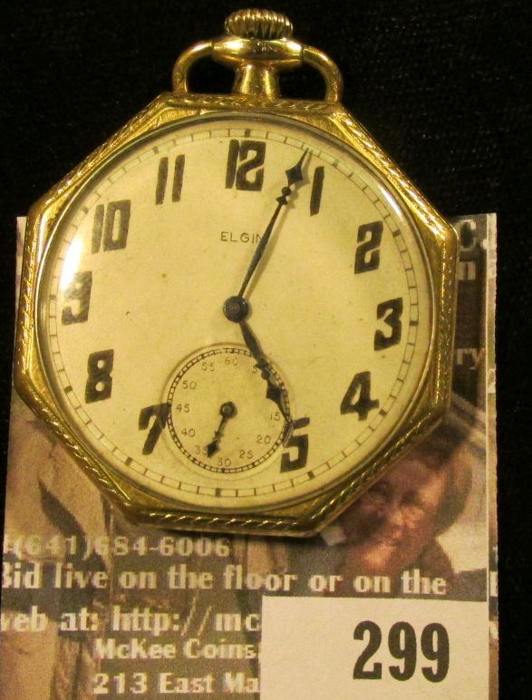 Elgin National Watch Company Men's Open face Pocket Watch with Engraved Oak Leaf design Silverode case. Seven Jewel. Movement no. 35635881. Octagonal case. "S" engraved.