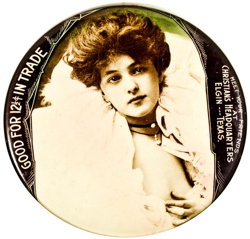 A beautiful young woman with upswept brown hair, two choker-style necklaces and surrounded by a very fluffy stole, holds her hand to her bosom while staring straight into the camera. Good For 12 1/2c printed to left, and to right is printed,Meet Your Friends at Christian's Headquarters, Elgin, Texas.