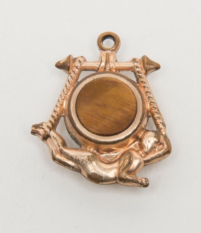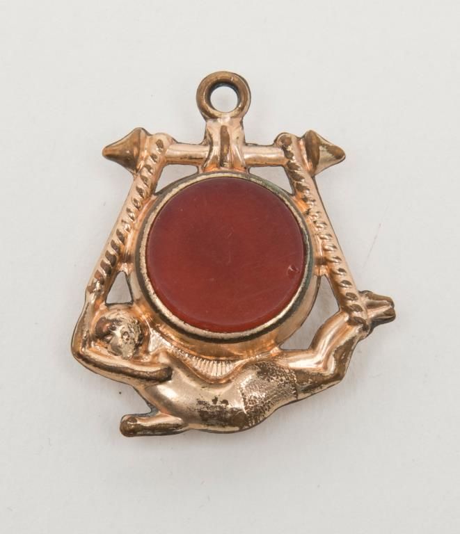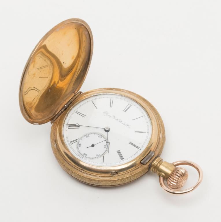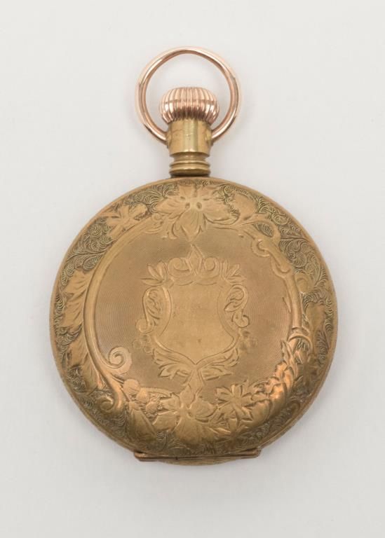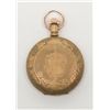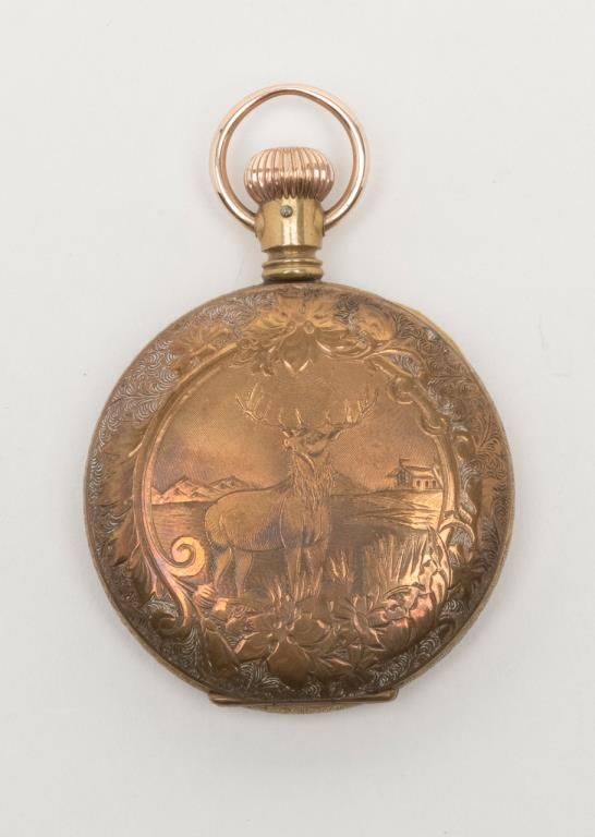 Elgin pocket watch with plated gold case in running condition showings stag on front with plated period chain and fob. Est.: $100-$200