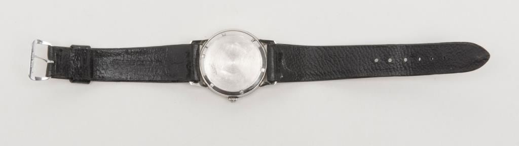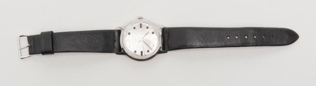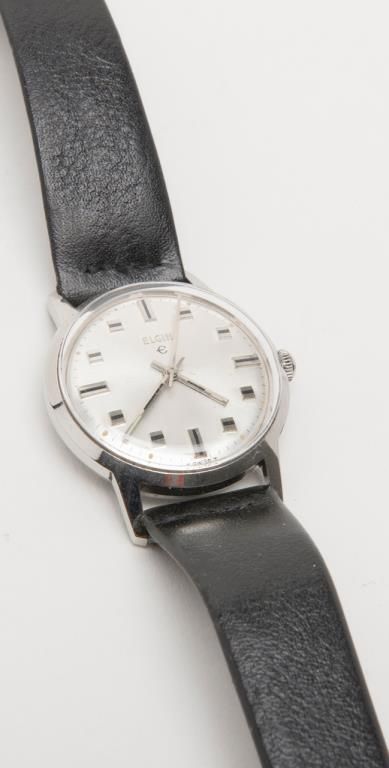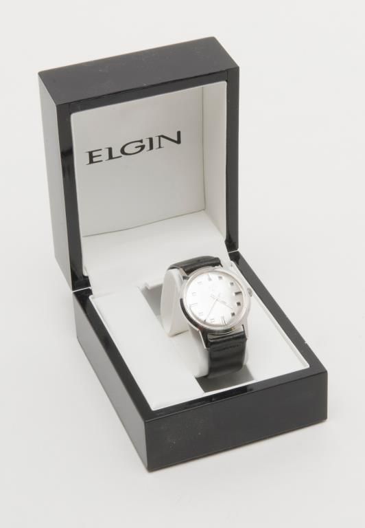 Elgin stainless steel wristwatch in factory box with leather strap, working at time of description. Est.: $150-$300.