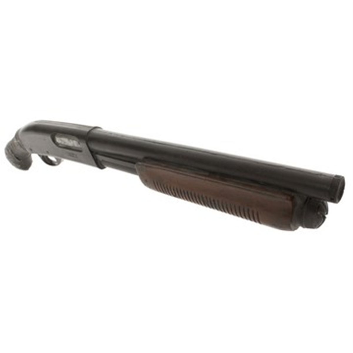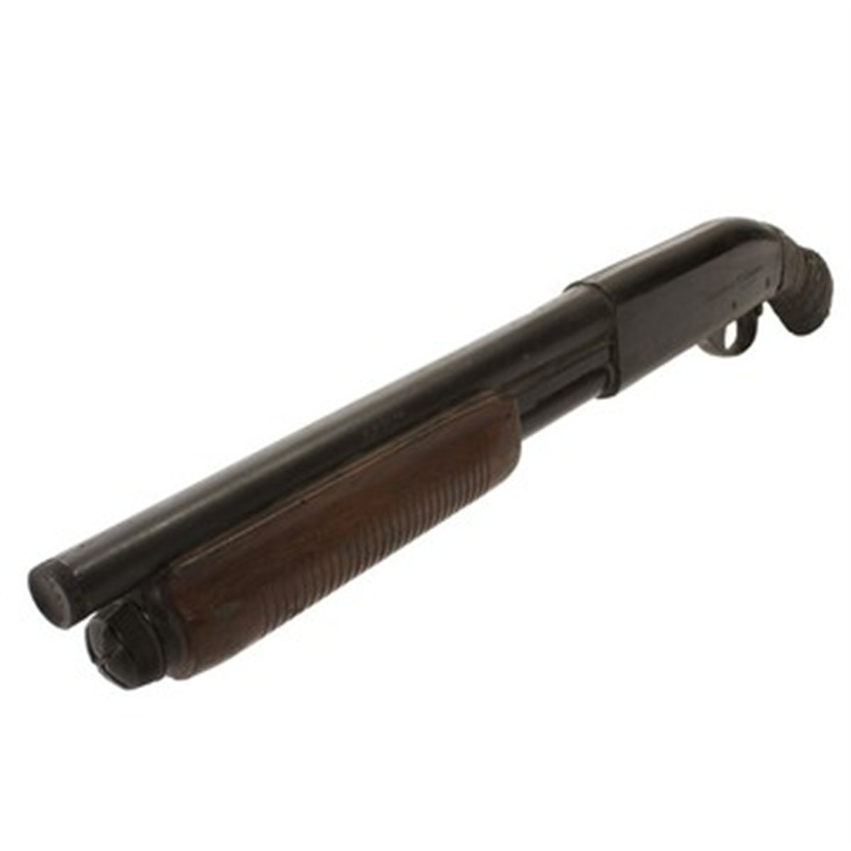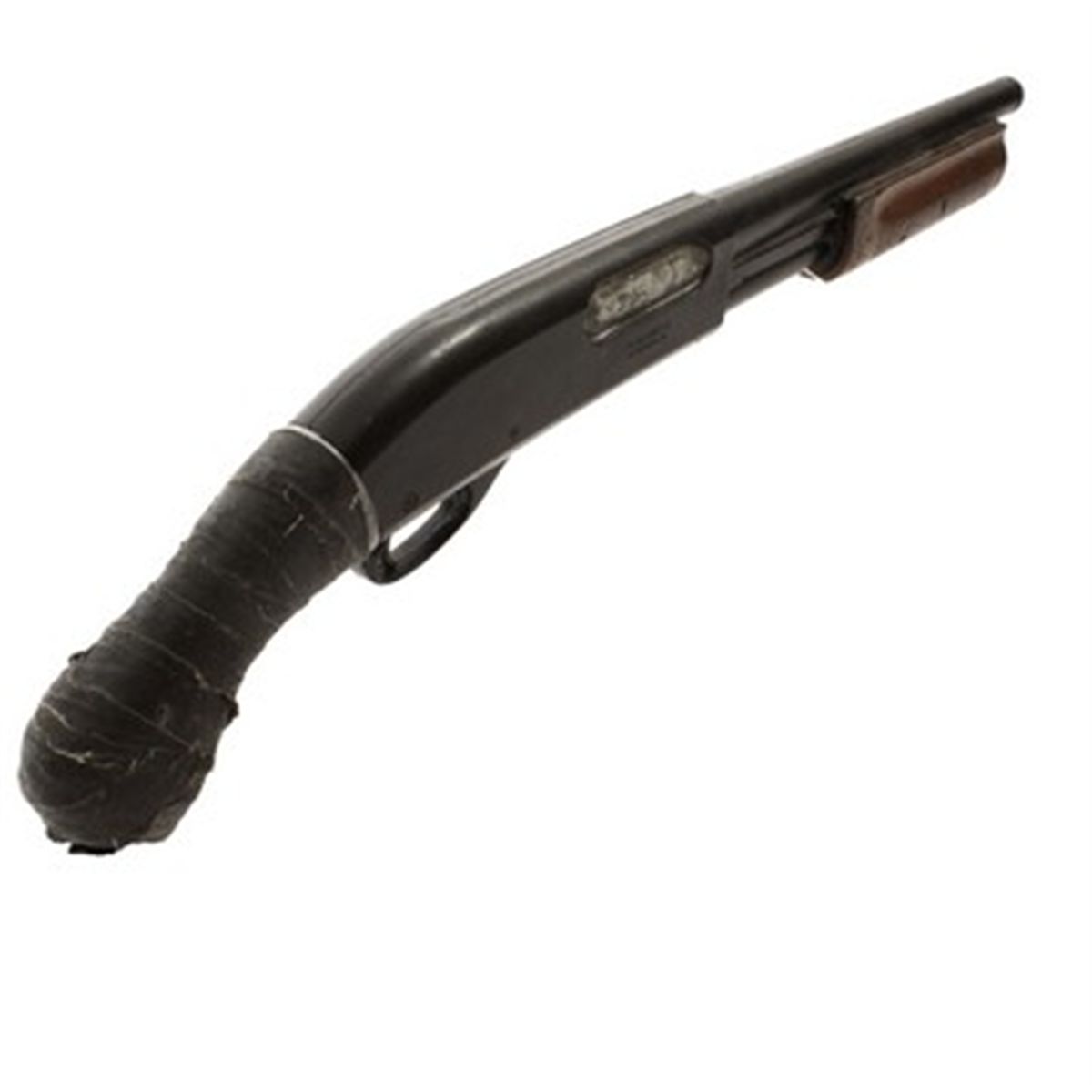 This non-firing prop shotgun was used by the character "Eli," portrayed by actor Denzel Washington, in the 2010 motion picture, "The Book of Eli." The prop weapon is modeled after a short barreled Remington 870 "Witness Protection" shotgun and is constructed of dense rubber with hand painted details to simulate the appearance of a live firing metal weapon. The shotgun has a heavily taped handle with various weathering to look like an antique firearm (film takes place in a post-apocalyptic world).