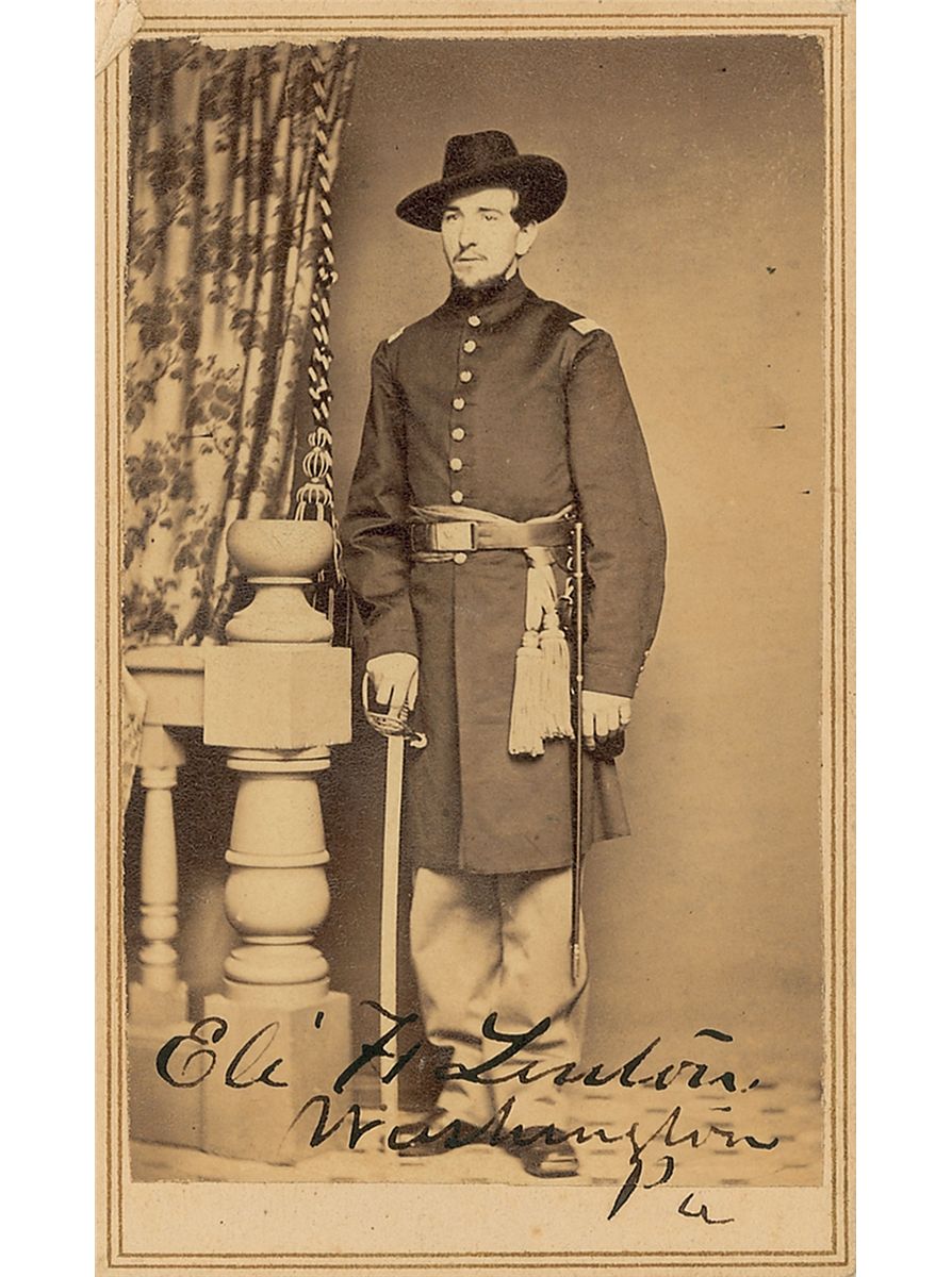 Union officer who served in the 39th US Colored Troops. Original 2.25 x 4 full-length carte-de-visite photo of Linton in full dress uniform by Louis Walzi, signed below the image in black ink, “Eli H. Linton, Washington, Pa.” In fine condition, with creases top left corner and pencil notations to reverse.