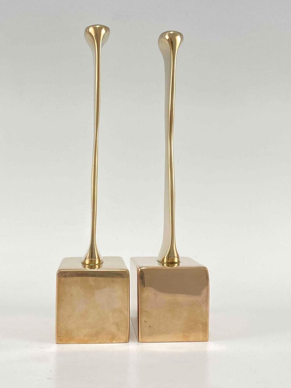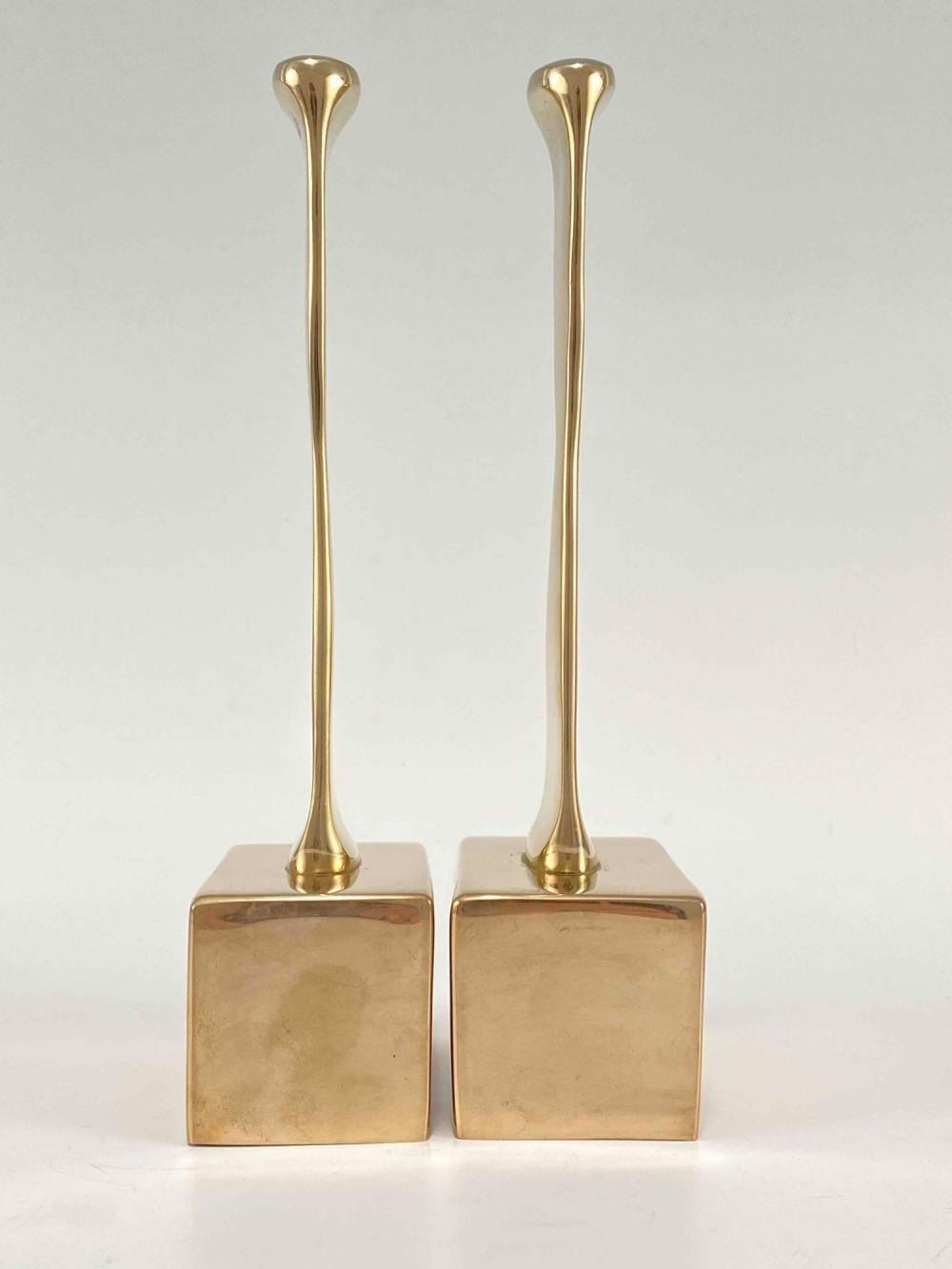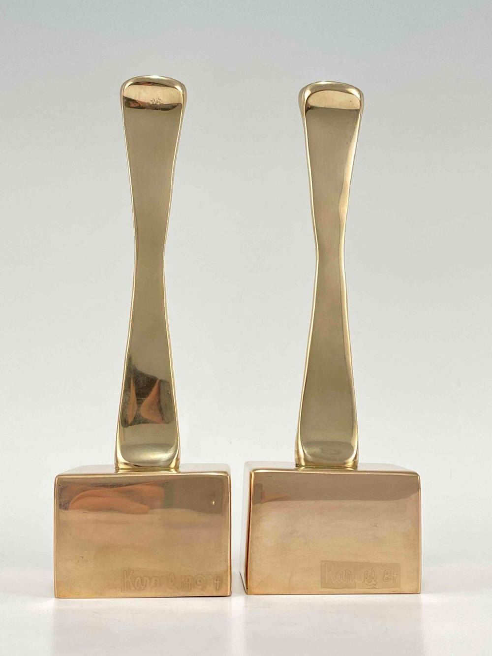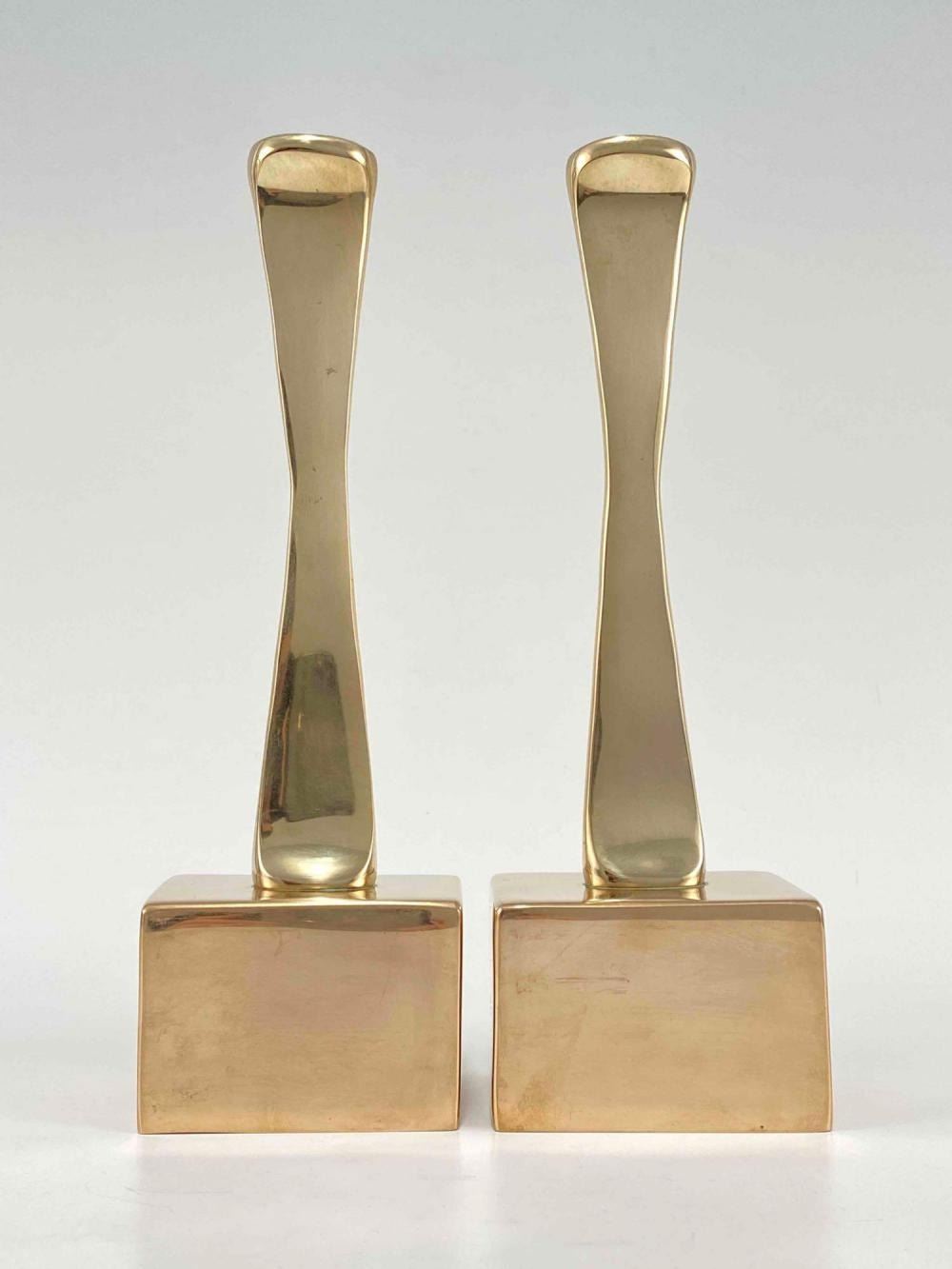Eli Karpel, Mid Century Modern Abstract Modernist Pair of Hih Polish Bronze Candlesticks, Marked Karpel 1984. Approximately 9.625H x 3.125W x 2.125D in.