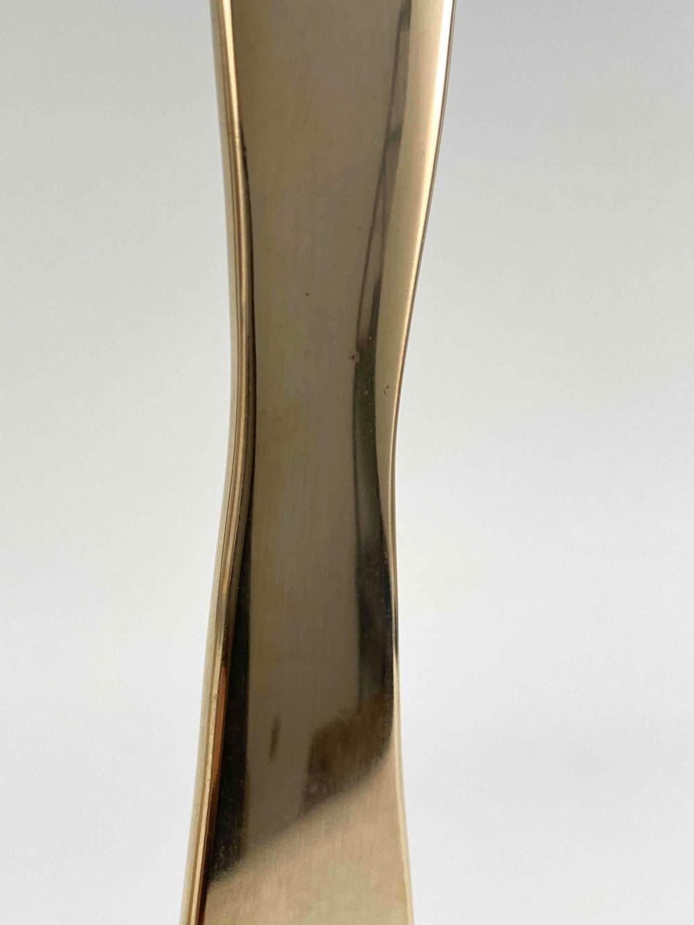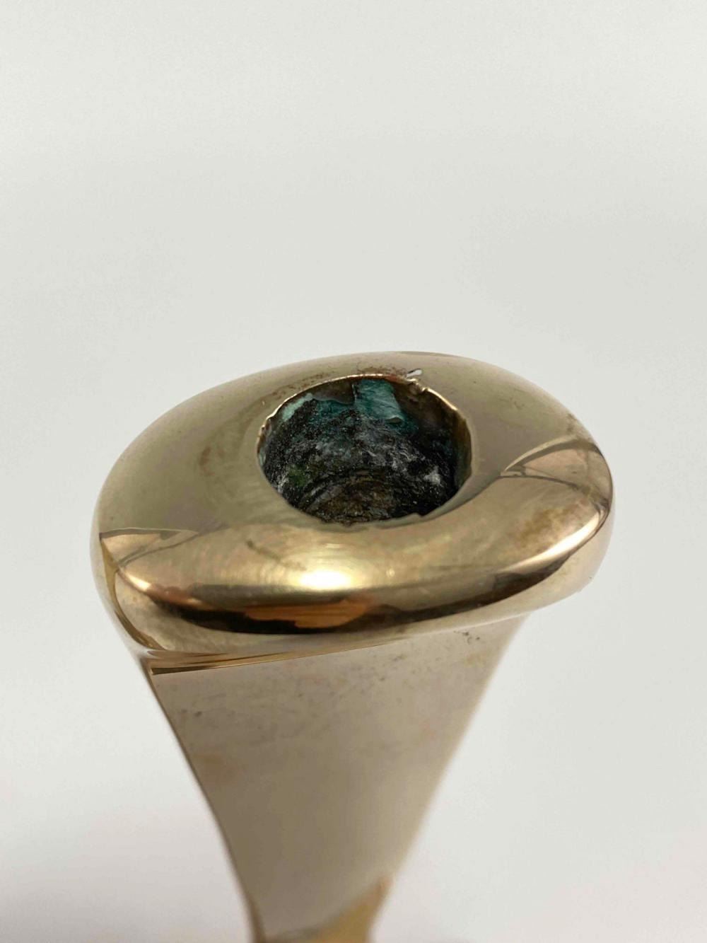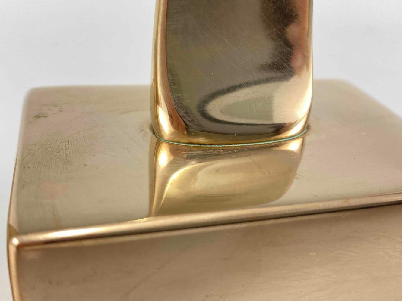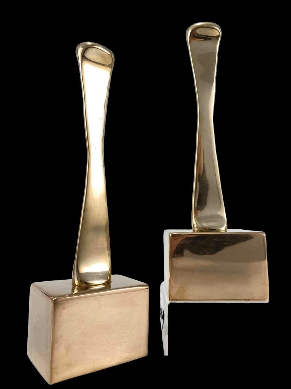 Eli Karpel, Mid Century Modern Abstract Modernist Pair of Hih Polish Bronze Candlesticks, Marked Karpel 1984. Approximately 9.625H x 3.125W x 2.125D in.