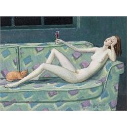 Eli Levin (American, b. 1938), “The Pensive Woman”, c. 1981; tempera/board, 9” x 12”, signed and dated. Santa Fe painter. Levin studied at the University of Wisconsin and the New School for Social Research (Greenwich Village). Levin lived in New York from 1945-60, and in Santa Fe after 1965. He exhibited extensively in the 1970s-80s, and his work is in important public and private collections, including that of Ralph Lauren, Doc Severinson, Tucson Museum, and the Museum of Fine Art, Santa Fe. He specialized in intimate scenes of figures in interiors.