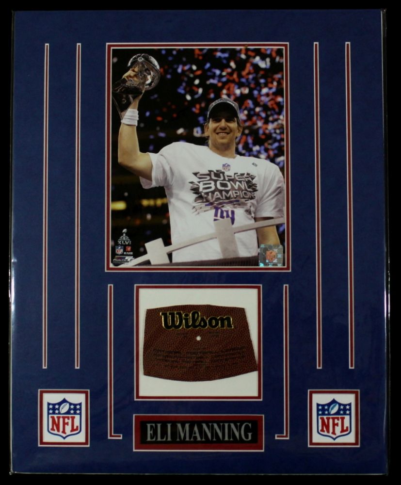 This piece measures 16x20 in size and is highlighted by a piece of football. The football has been custom matted with an 8x10 photo of Eli Manning.