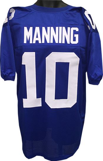 You look at this man, and you see a kid. But, then you see his command at the line of scrimmage, in total control as he bellows out commands to his teammates. You see the courage with which he stands in the pocket, resolute as a statue despite all that meat coming at him. You watch him throw a pass deep along the sideline that looks like it’s surely going out of bounds – but that finds the arms of his receiver like a heat-seeking missile. Now you look at this kid and you see not only a man, but a real field general – a leader of men. He isn’t Archie’s son, or Peyton’s little brother. He’s Eli Manning, humble two-time Super Bowl MVP, and giant among Giants. Among his career accomplishments, Eli is a 3x Pro Bowl selection, a 2x Super Bowl XLII & XLVI champion & MVP! Manning also holds the record for most game winning drives and 4th quarter TDs in a single season! This is an Eli Manning New York Giants unsigned Blue unlicensed custom-prostyle jersey with twill stitched nameplate and numbers. Perfect for autograph or to wear. Size XL