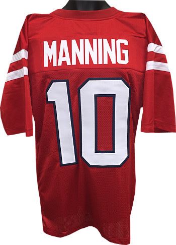 During his football career at Ole Miss, Eli Manning set or tied 45 single-game, season, and career records. His career numbers include 10,119 passing yards, 81 touchdown passes, and a passer rating of 137.7. Manning also led the Rebels to a 10-3 record and a 31-28 SBC Cotton Bowl Classic victory over the Oklahoma State Cowboys in 2003. This is a Eli Manning Ole Miss Rebels unsigned Red unlicensed custom-prostyle jersey with twill stitched nameplate and numbers. perfect for autograph or to wear! Size XL