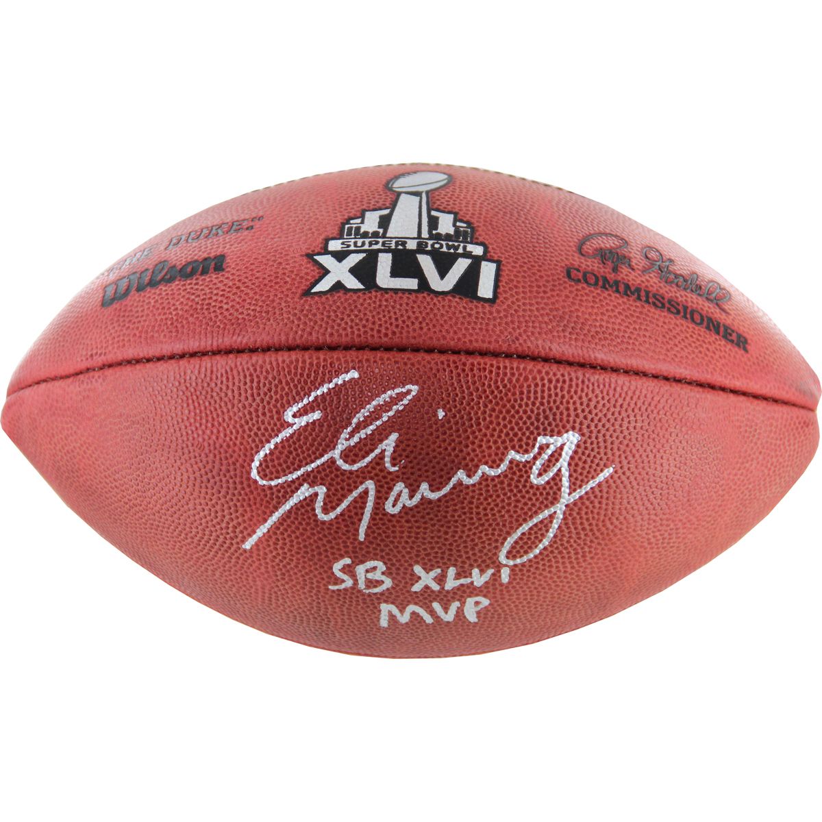 Eli Manning Signed & SB MVP Inscribed Official Wilson Leather NFL Football. Comes with a Certificate of Authenticity with matching #'d holograms and online verification from VA Auctions. This is a stock photograph which means that you will receive an item of the same or higher quality and excellence.