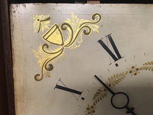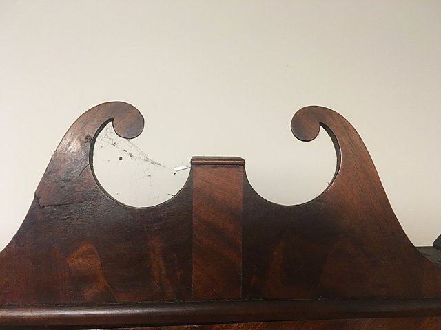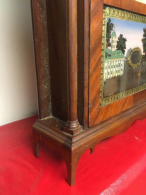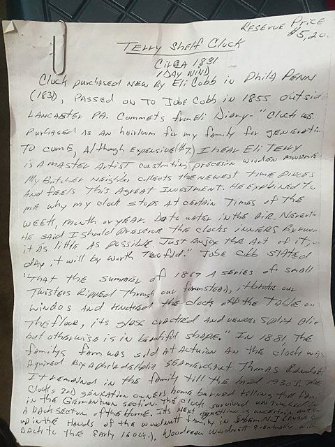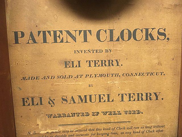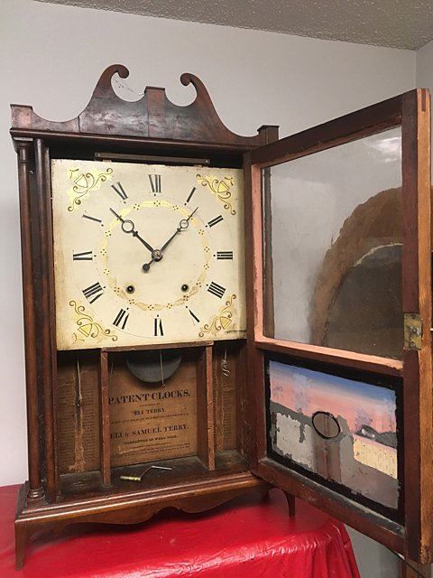 Eli & Samuel Terry, Plymouth, Connecticut, mahogany pillar and scroll shelf clock, c. 1831. Scroll top, hand painted wooden dial with gold gilt, turned columns, reverse painted lower tablet (some loss), French feet with scalloped apron. 30 hour, wooden works, weight driven clock. This clock also comes with hand written history of the ownership of this clock. Measures approx. 29" tall x 17 1/2" wide x 4 1/2" deep