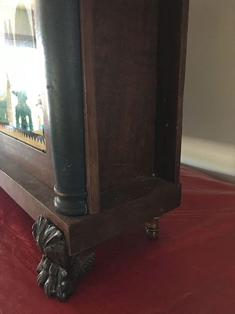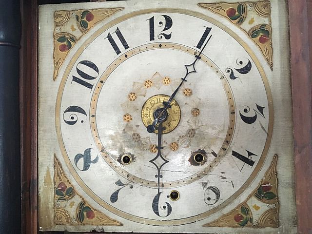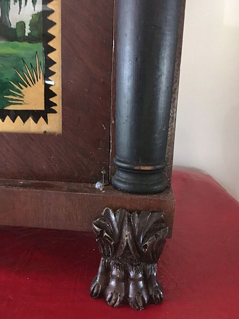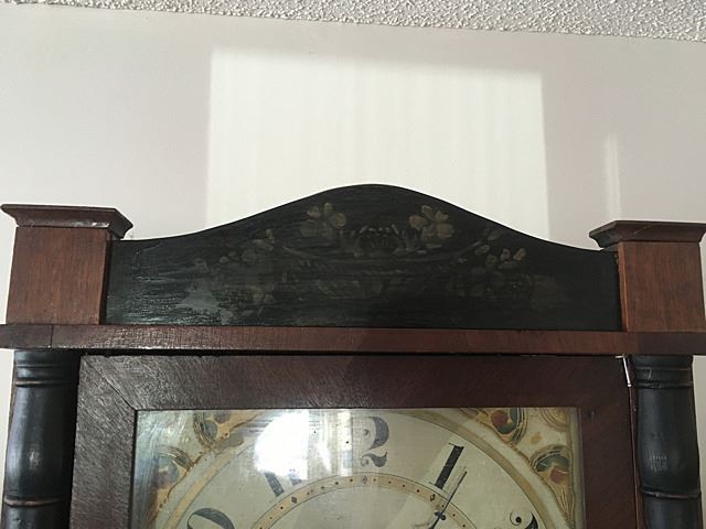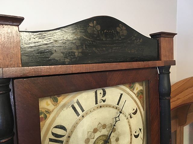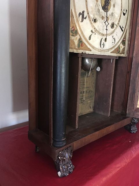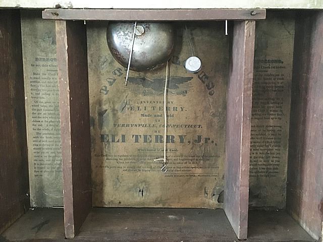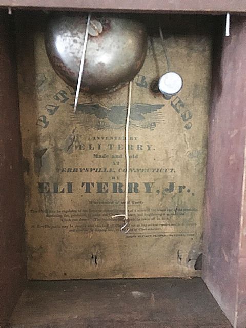 Eli Terry, Jr. Column and Splat Shelf clock, very nice label, "Patent Clocks, Invented by Eli Terry. Made and Sold in Terrysville, Connecticut by Eli Terry, Jr." Transition shelf clock with alarm, wooden works, stenciled splat, reverse painted glass, ornate hand painted dial, claw feet. Measures approx. 28" tall x 16 1/2" wide x 5 1/2" deep. Many Eli Terry Clocks which depict a home or building on the reverse painted glass tablet, are actual homes in the Town of Plymouth and surrounding Connecticut towns of the time period.