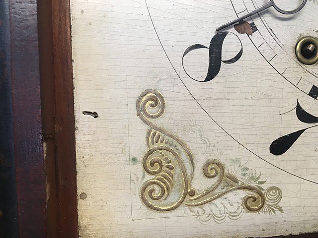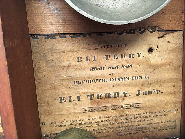 Eli Terry, Jr. stenciled column and splat shelf clock, Plymouth, Connecticut, ca. 1840s. Stenciled columns and splat with reverse painted and stenciled lower glass tablet. Wooden works, weight driven, with hand painted dial, claw feet (some loss on feet). Very nice label, "Patent Clocks, Invented by Eli Terry, Made and Sold in Plymouth, Connecticut by Eli Terry, Jun'r.". Measures approx. 28 1/2" tall x 17" wide x 4" deep. Many Eli Terry Clocks which depict a home or building on the reverse painted glass tablet, are actual homes in the Town of Plymouth and surrounding Connecticut towns of the time period.