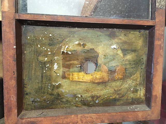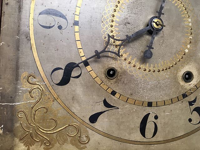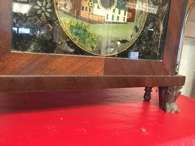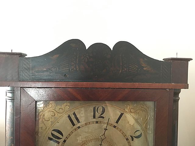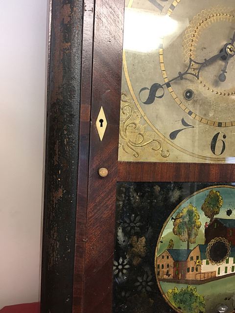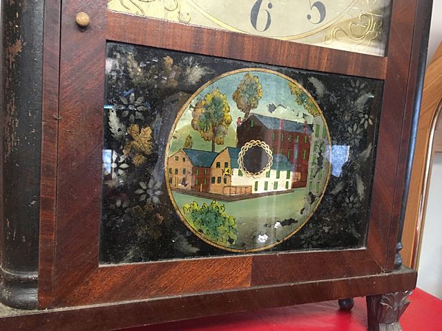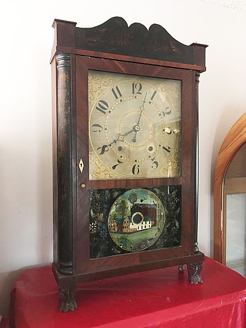 Eli Terry, Jr. Column and Splat Shelf Clock, Plymouth, Connecticut, c. 1840. Stenciled splat and quarter columms, hand painted gilt dial, reverse painted and stenciled glass, unique scene in circle around pendulum apeture, claw feet, nice label "Patent Clocks. Invented by Eli Terry, Made and Sold at Plymouth, Connecticut by Eli Terry, Jun'r.". Wooden works, weight driven, key wind, pendulum clock. Many Eli Terry Clocks which depict a home or building on the reverse painted glass tablet, are actual homes in the Town of Plymouth and surrounding Connecticut towns of the time period. Measures approx. 28" tall x 17" wide x 4" deep.