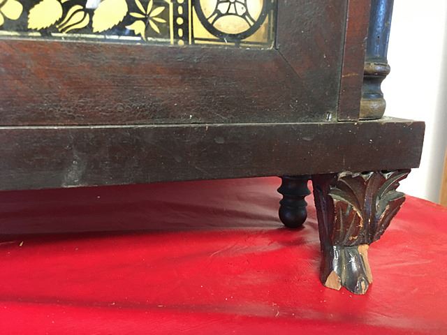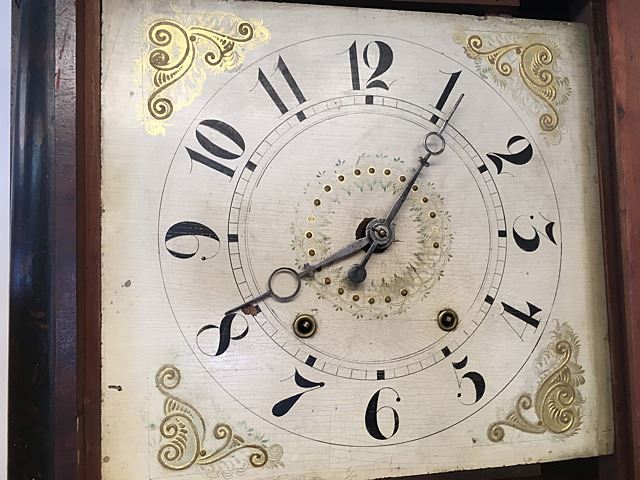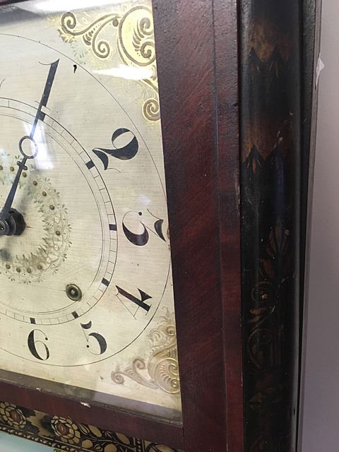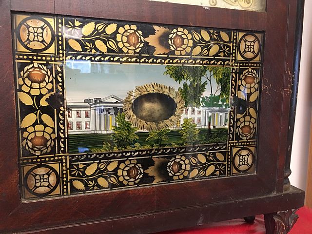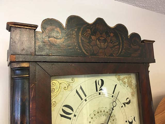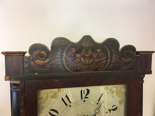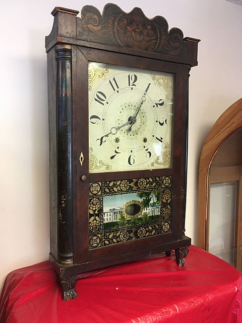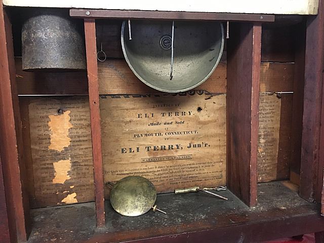 Eli Terry, Jr. stenciled column and splat shelf clock, Plymouth, Connecticut, ca. 1840s. Stenciled columns and splat with reverse painted and stenciled lower glass tablet. Wooden works, weight driven, with hand painted dial, claw feet (some loss on feet). Very nice label, "Patent Clocks, Invented by Eli Terry, Made and Sold in Plymouth, Connecticut by Eli Terry, Jun'r.". Measures approx. 28 1/2" tall x 17" wide x 4" deep. Many Eli Terry Clocks which depict a home or building on the reverse painted glass tablet, are actual homes in the Town of Plymouth and surrounding Connecticut towns of the time period.