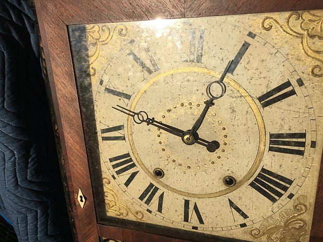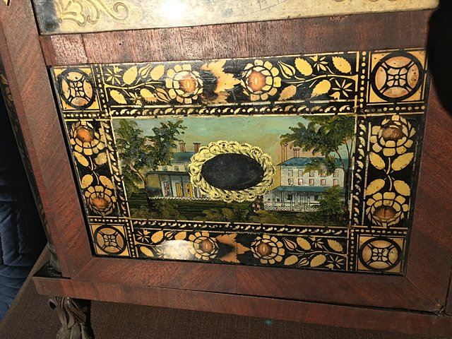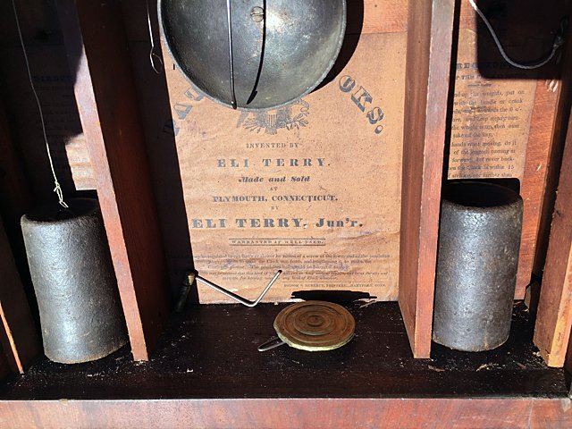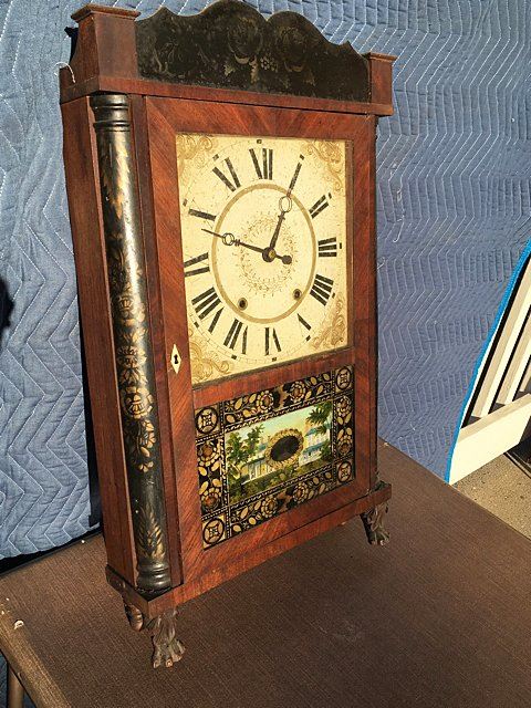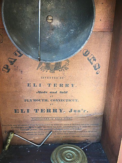 Eli Terry, Jr., Plymouth, CT, Quarter Column Transitional stenciled clock. Stenciled columns and splat with flowers, reverse painted glass, claw feet, beautiful label "Patent Clocks, Invented by Eli Terry, Made and Sold in Plymouth, Connecticut by Eli Terry, Jun'r.". Weight driven, wooden works clock, with hand painted dial, key and pendulumn. Measures approx. 28" tall x 17" wide x 4" deep. Many Eli Terry Clocks which depict a home or building on the reverse painted glass tablet, are actual homes in the Town of Plymouth and surrounding Connecticut towns of the time period.
