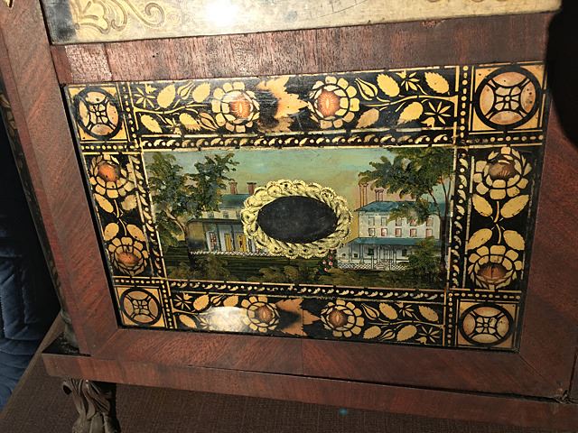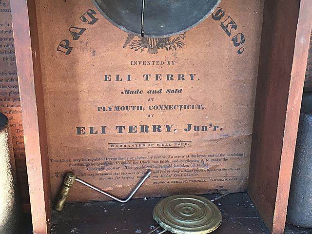 Eli Terry, Jr., Plymouth, CT, Quarter Column Transitional stenciled clock. Stenciled columns and splat with flowers, reverse painted glass, claw feet, beautiful label "Patent Clocks, Invented by Eli Terry, Made and Sold in Plymouth, Connecticut by Eli Terry, Jun'r.". Weight driven, wooden works clock, with hand painted dial, key and pendulumn. Measures approx. 28" tall x 17" wide x 4" deep. Many Eli Terry Clocks which depict a home or building on the reverse painted glass tablet, are actual homes in the Town of Plymouth and surrounding Connecticut towns of the time period.