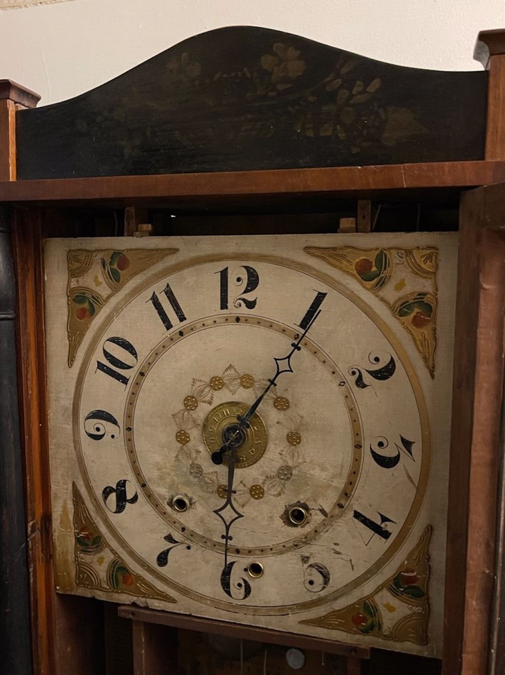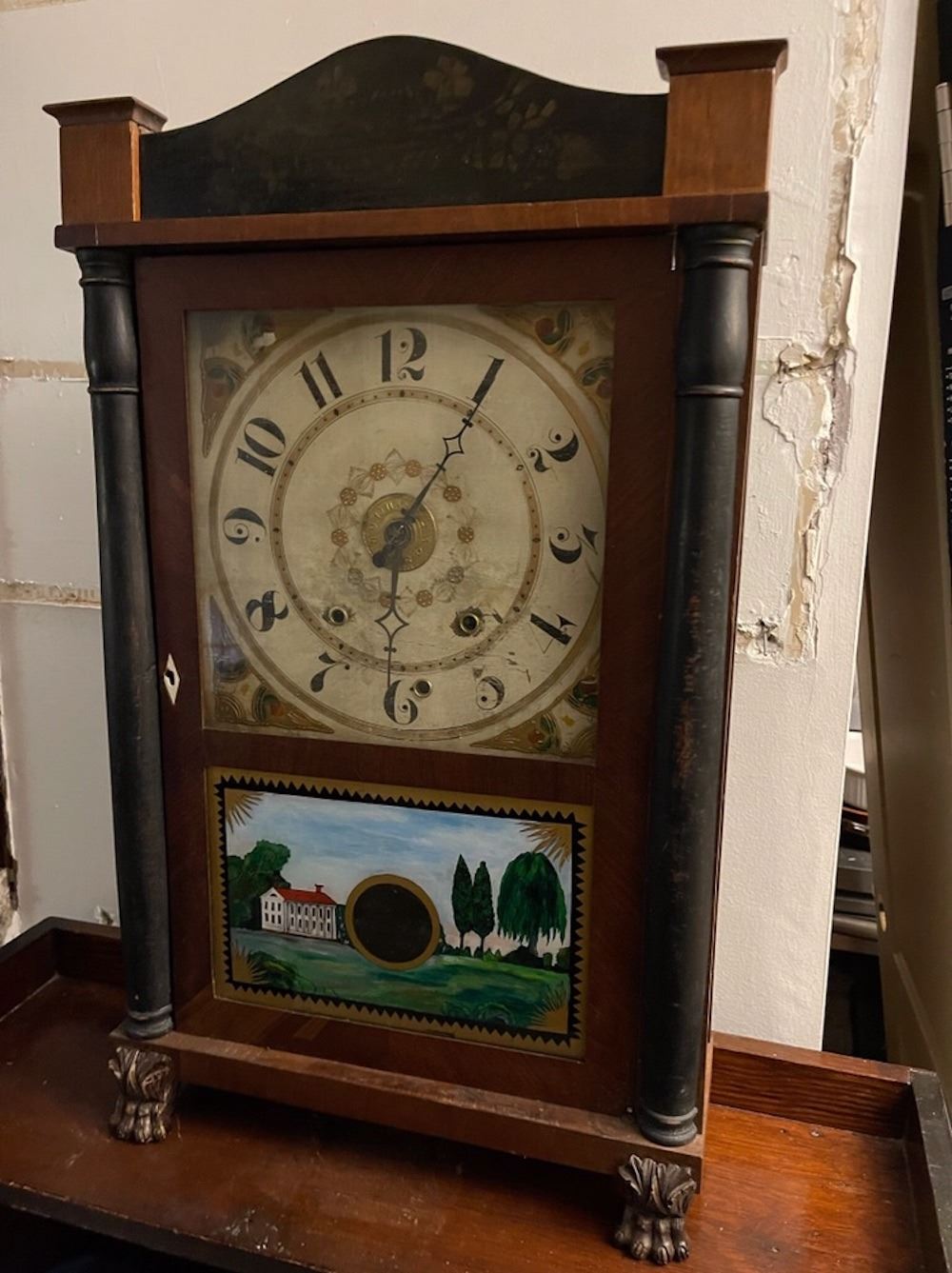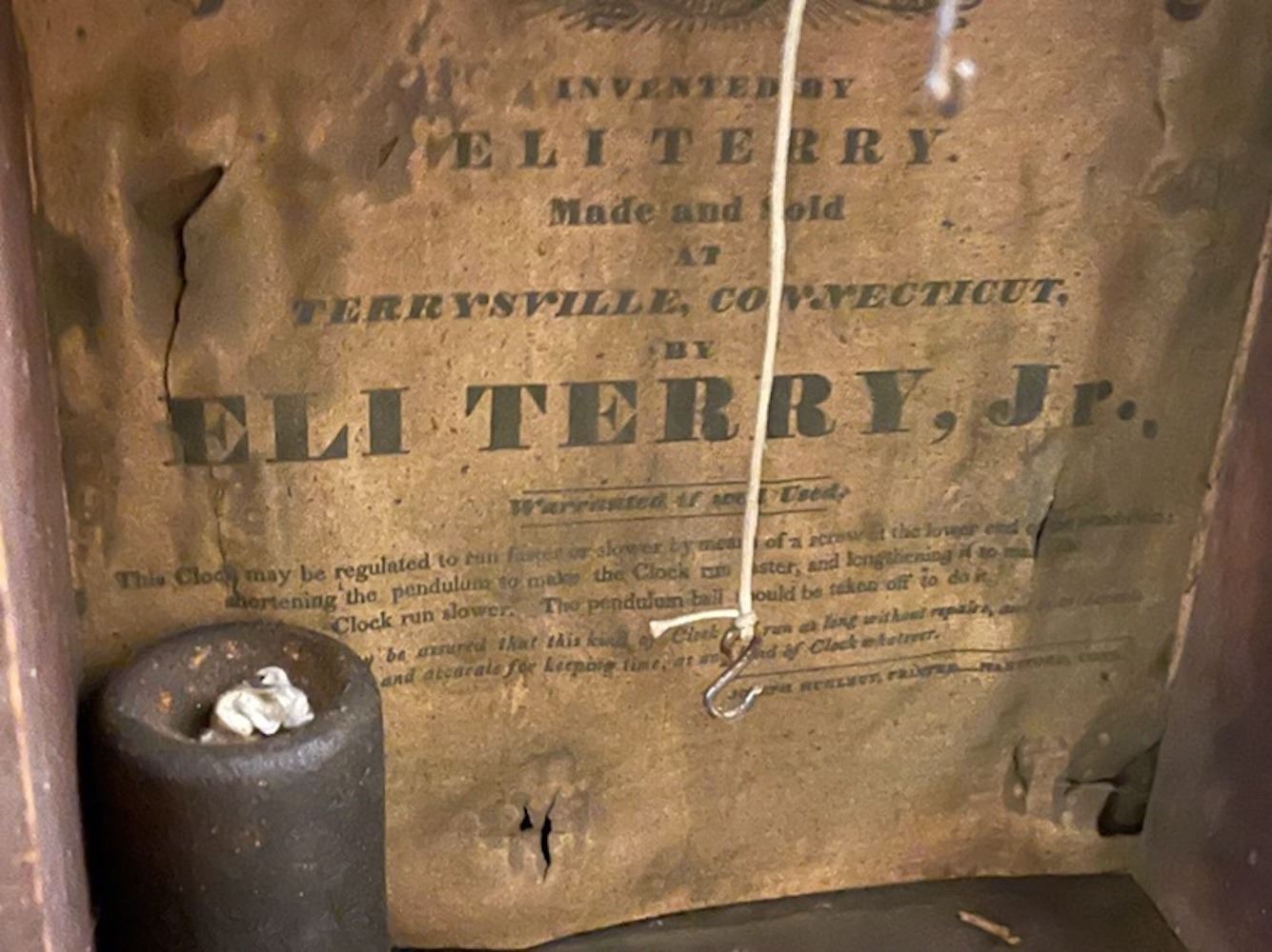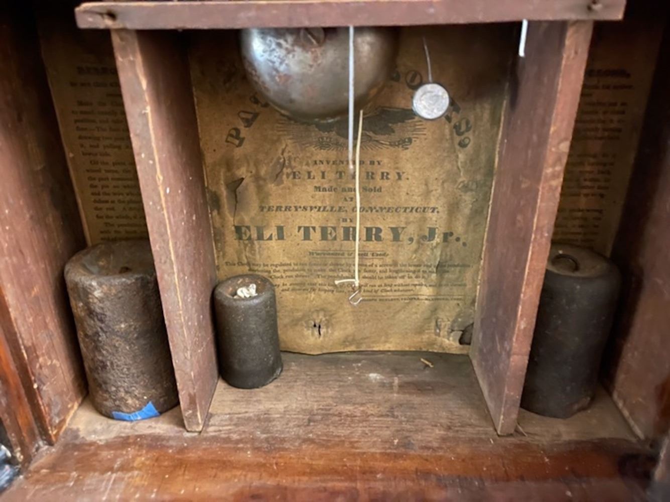 Eli Terry Jr., Terryville, Connecticut, all original shelf clock, nice reverse painted glass, paper label, original hand painted dial, stenciled case with claw feet. From the lifetime collection.