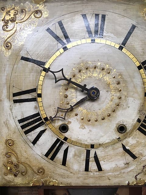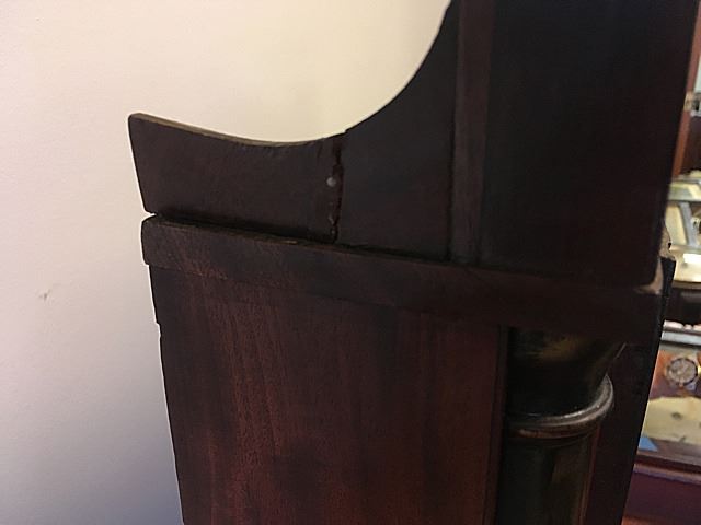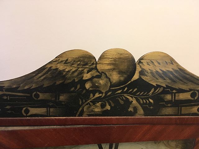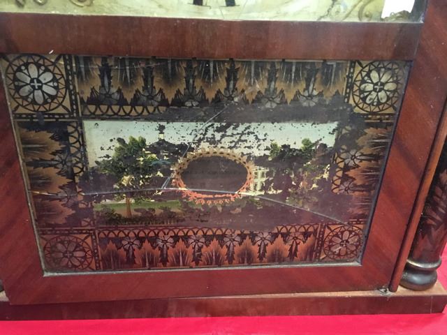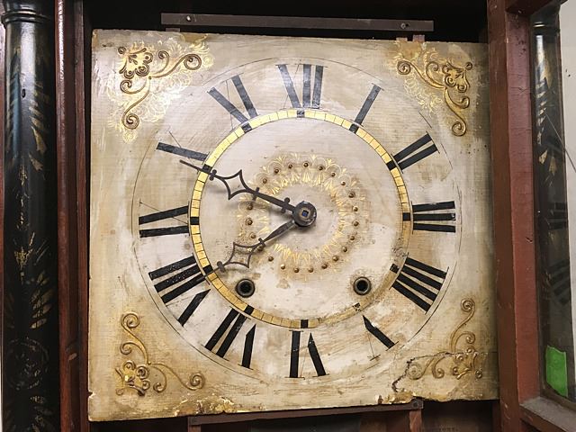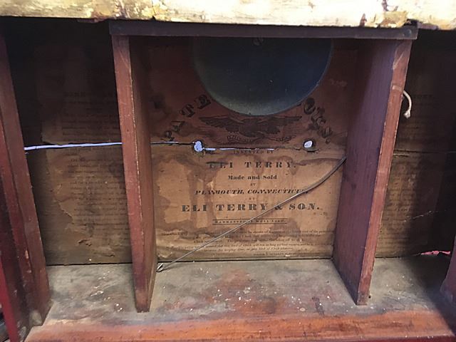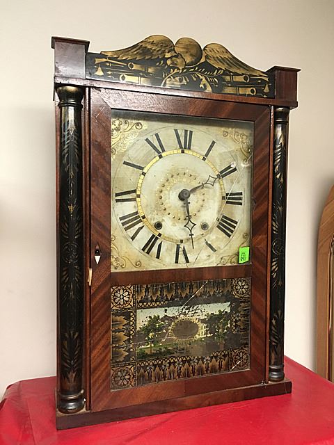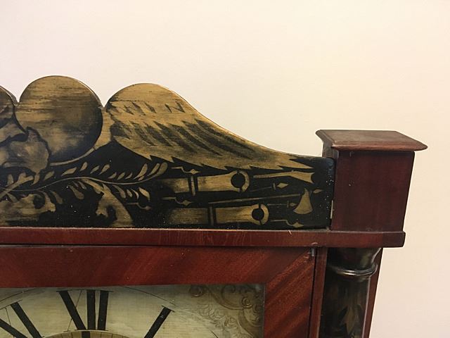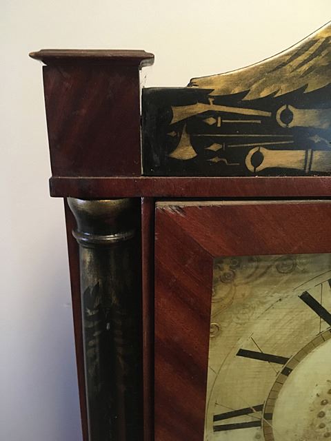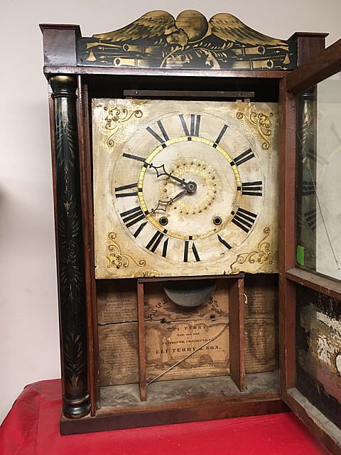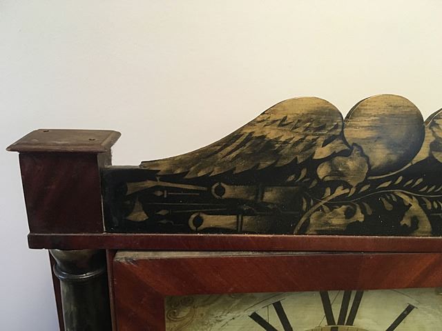 Eli Terry, Jr., Plymouth Connecticut with stenciled splat. Stencil depicts eagle with cannons, guns, spears and axes, stenciled columns, reverse painted glass, weight driven wooden works. Beautiful label with eagle, "Invented by Eli Terry, Made and Sold in Plymouth, Connecticut. Eli Terry & Son". Measures approx. 26" tall x 17 1/2" wide x 3 1/2" deep.