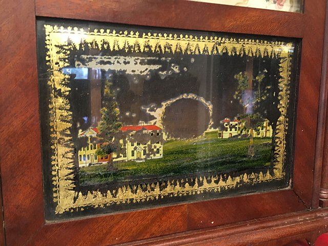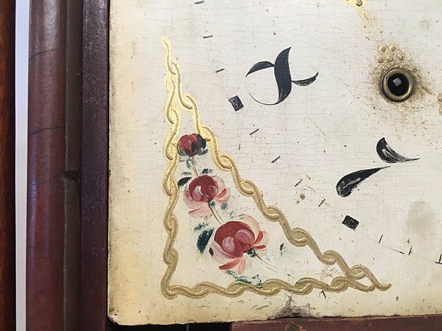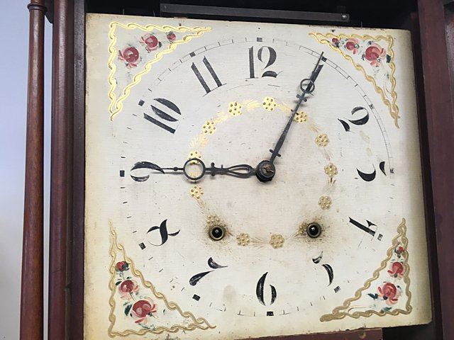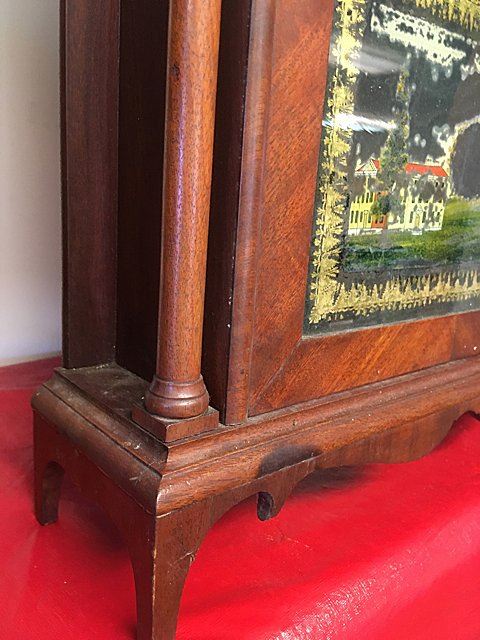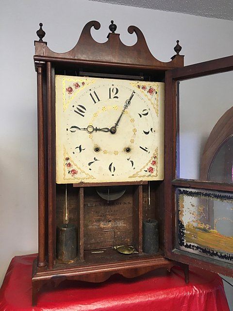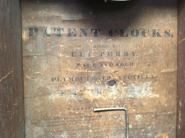 Eli Terry Pillar and Scroll Shelf Clock, Plymouth, Connecticut, c. 1825. Scroll top case with three wooden finials, turned columns, hand painted dial with flowers in corners, reverse plainted tablet, label "Patent Clocks, Invented by Eli Terry, Made and Sold in Plymouth, Connecticut". 30 hour wooden works, weight driven, key and pendulum, measures approx. 29" tall x 17" wide x 4 1/2" deep. Many Eli Terry Clocks which depict a home or building on the reverse painted glass tablet, are actual homes in the Town of Plymouth and surrounding Connecticut towns of the time period.