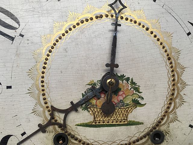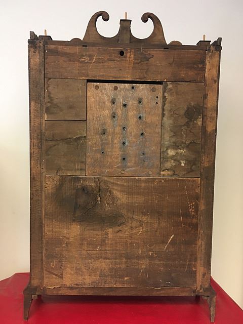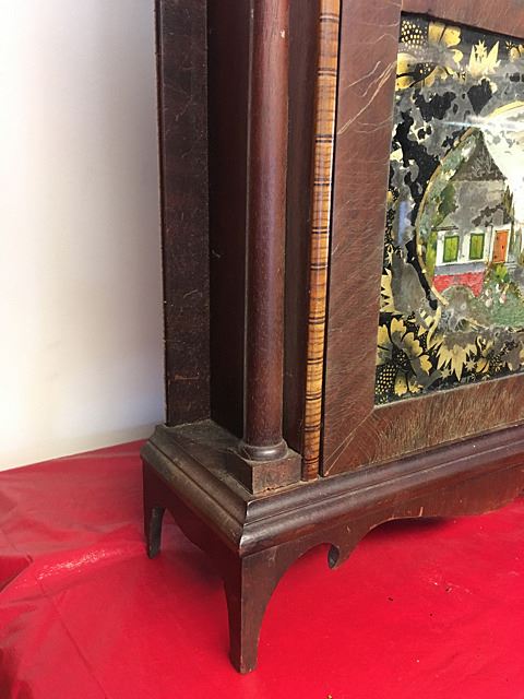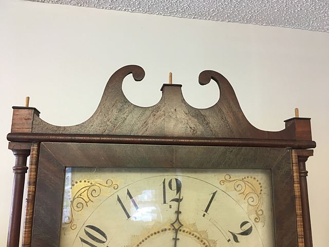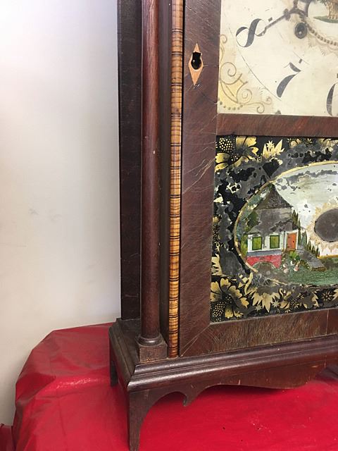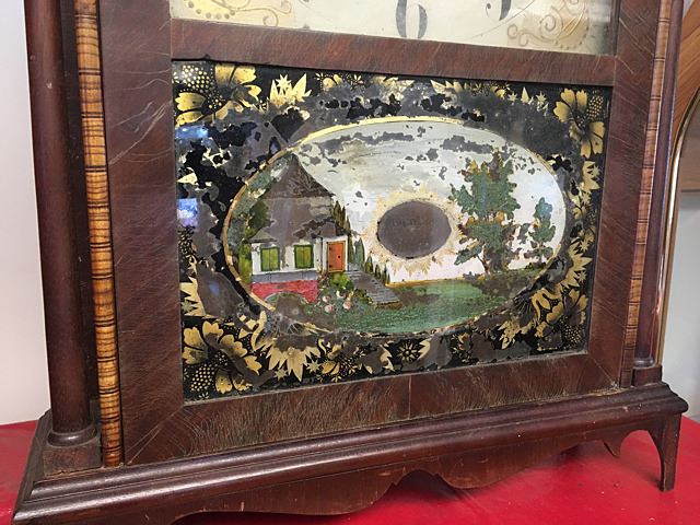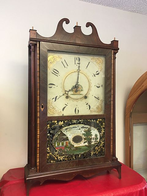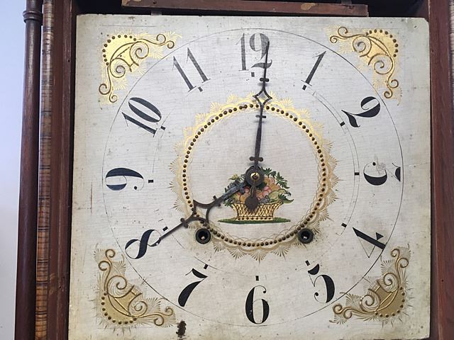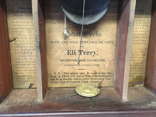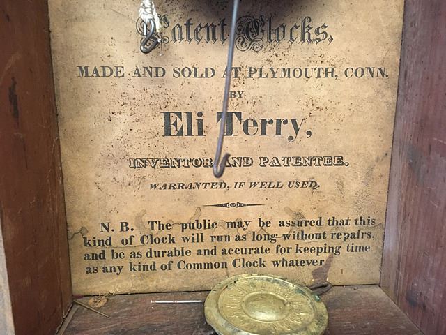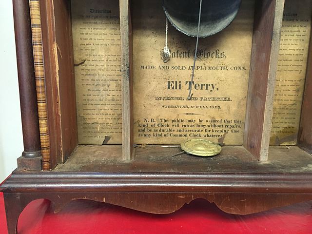Eli Terry Pillar and Scroll Shelf Clock, Plymouth, Connecticut, c. 1825. Scroll top case, turned columns, hand painted dial with raised gilt and fruit basket in center, reverse plainted tablet, exceptional label "Patent Clocks, Invented by Eli Terry, Made and Sold in Plymouth, Connecticut". 30 hour wooden works, weight driven, key and pendulum, measures approx. 29" tall x 17" wide x 4 1/2" deep. Many Eli Terry Clocks which depict a home or building on the reverse painted glass tablet, are actual homes in the Town of Plymouth and surrounding Connecticut towns of the time period.