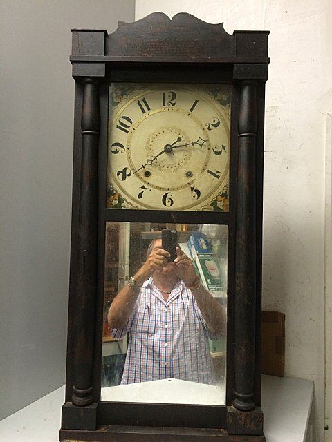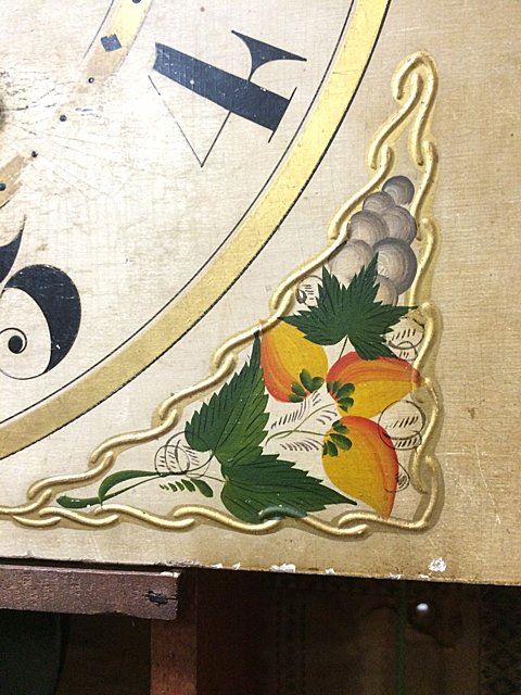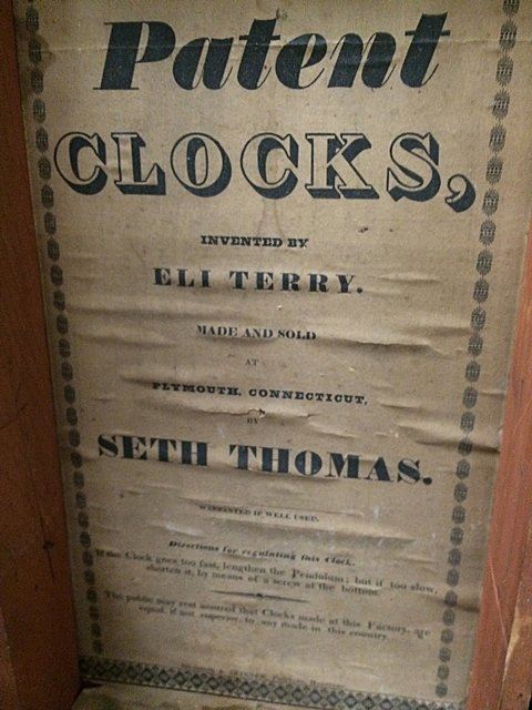 Seth Thomas, invented by Eli Terry, Plymouth, CT weight driven wooden works shelf clock with gorgeous original label "Patent Clocks, Invented by Eli Terry, Made and Sold at Plymouth, Connecticut by Seth Thomas" with full instructions, original weights, stenciling in weaved basket with flower, stenciled coloumns, ivory key enscution, loveley painted dial with fruit, mirror front, all original with original back.