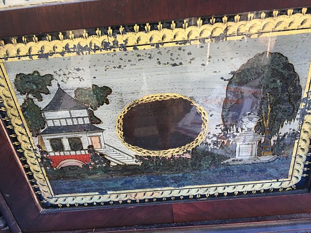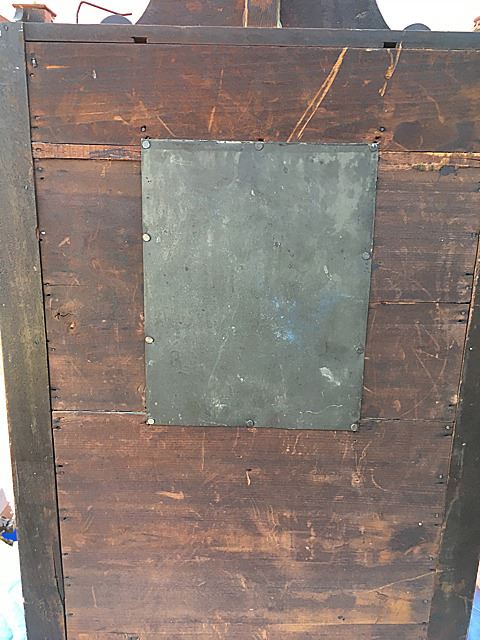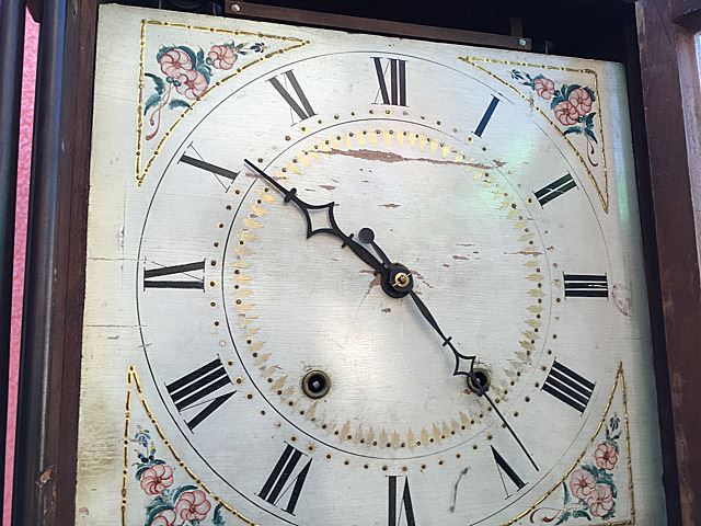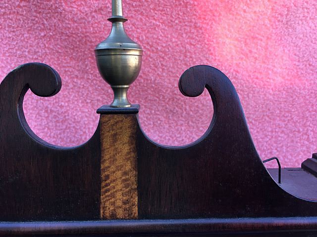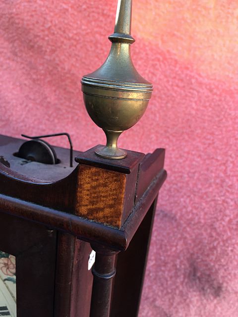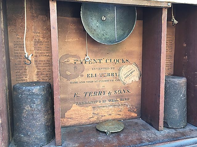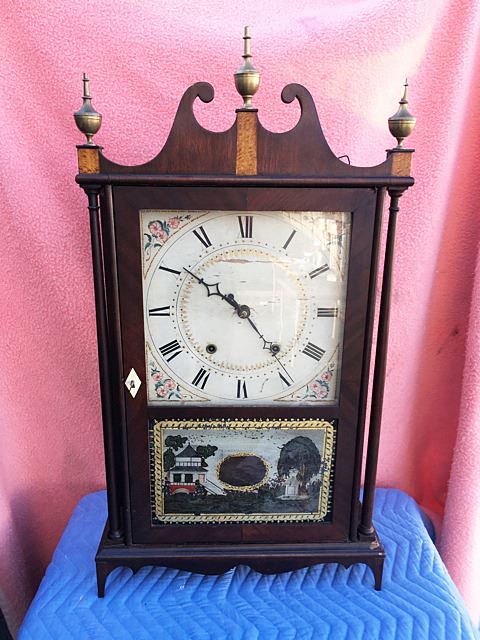 Eli Terry and Sons, Plymouth CT, Pillar and Scroll clock. Weight driven, wooden works, label "Patent Clocks, invented by Eli Terry, Made and sold at Plymouth, CT, E. Terry & Sons". Pendulum, hand painted dial with open diamond hands, mahogany case, 3 brass finials, reverse painted glass, free standing turned columns. Measures approx. 31" tall x 17" wide x 4" deep. Many Eli Terry Clocks which depict a home or building on the reverse painted glass tablet, are actual homes in the Town of Plymouth and surrounding Connecticut towns of the time period.