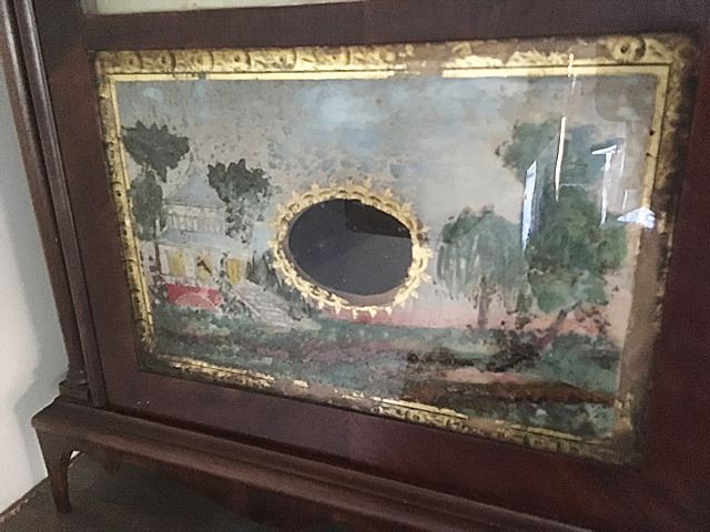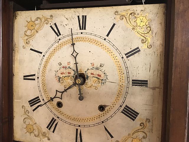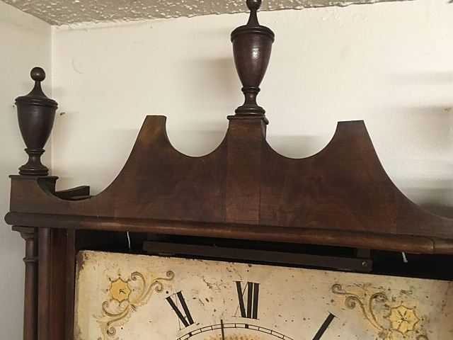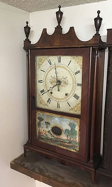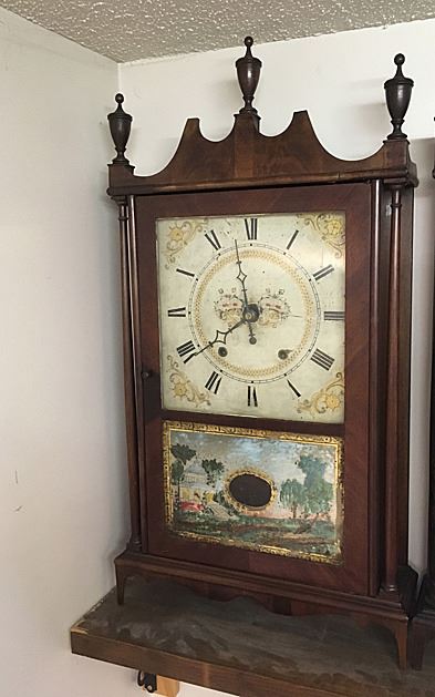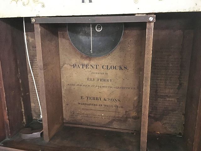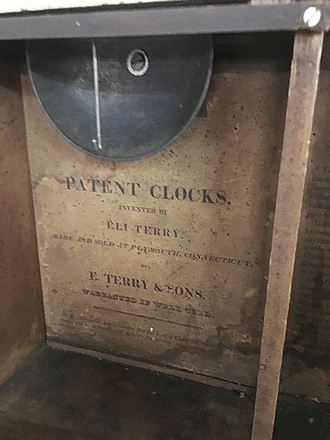 Eli Terry and Sons Pillar and Scroll Shelf Clock, Plymouth, Connecticut, ca. 1820s. Weight driven, wooden works, with beautiful hand painted dial, reverse painted glass tablet, wooden urn finials, very nice label, "Patent Clocks, Invented by Eli Terry, Made and Sold at Plymouth Connecticut, E. Terry & Sons.", measures approx. 31 1/2" tall x 16 1/2" wide x 4 1/2" deep. Many Eli Terry Clocks which depict a home or building on the reverse painted glass tablet, are actual homes in the Town of Plymouth and surrounding Connecticut towns of the time period.