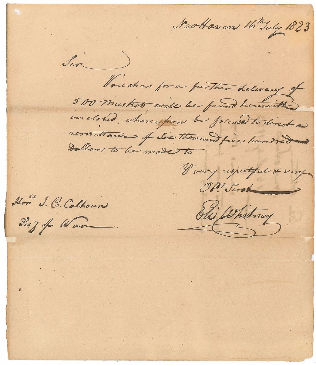 Important American inventor (1765–1825) remembered for developing the cotton gin. Rare ALS, one page, 8 x 9, July 16, 1823. Letter to Secretary of War John C. Calhoun regarding a contract for muskets, in full: "Voucher for a further delivery of 500 muskets, will be found herewith inclosed, whereupon be pleased to direct a remittance of six thousand five hundred dollars." In very good to fine condition, with small areas of paper loss and splitting along folds reinforced with archival tape on the reverse, and docketing on the back lightly showing through. On the verge of bankruptcy thanks to litigation concerning his cotton gin invention, Whitney turned to the manufacture of muskets in the late 1790s in hopes of turning a profit. He received a government contract in 1798 to deliver 10,000–15,000 muskets by 1800, but failed to fill the order until 1809. However, Whitney was a champion of interchangeable parts and, demonstrating an improved production process, was able to secure a second contract for 15,000 arms in 1812. Arms manufacture would become Whitney's primary business for the rest of his life. An outstanding letter connecting one of America's greatest early inventors to the development of the US Army.