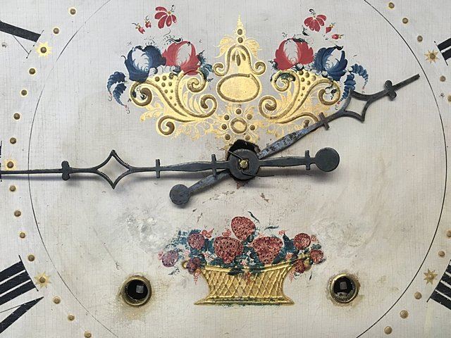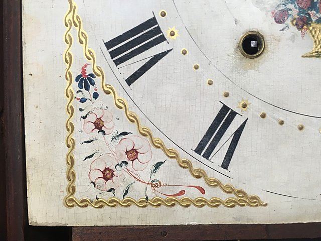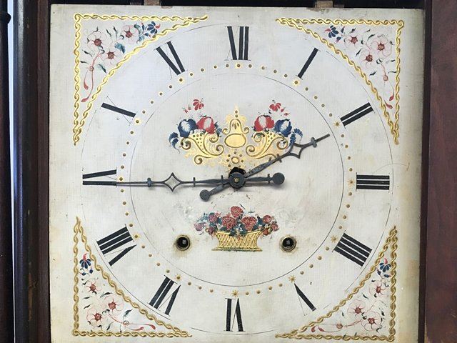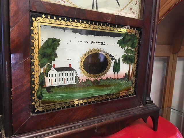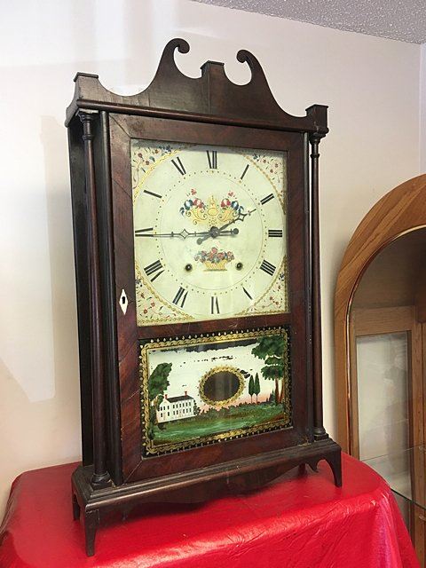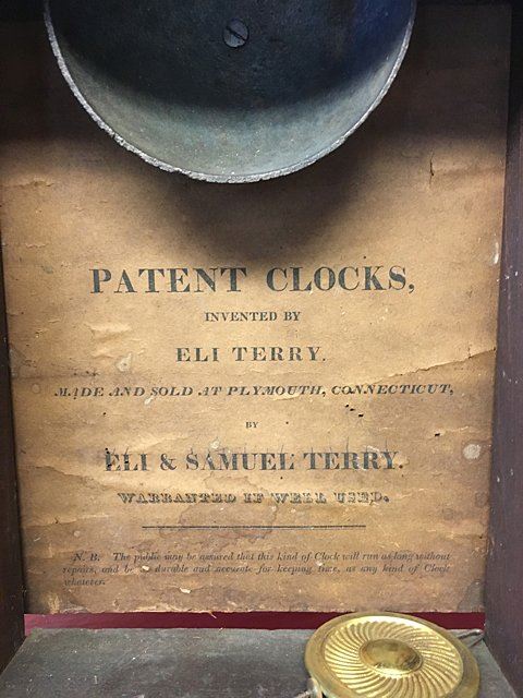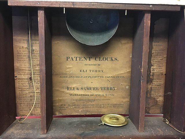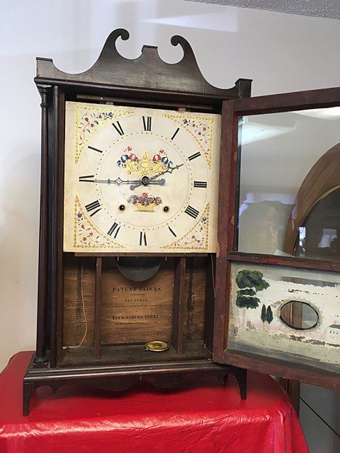 Eli and Samuel Terry, Plymouth, Connecticut, c. 1820s, weight driven, wooden works, thirty-hour, pillar and scroll shelf clock. Mahogany veener case with hand painted dial featuring fruit basket and flowers, reverse painted glass lower tablet, very nice label "Patent Clocks, invented by Eli Terry, Made and Sold at Plymouth, Connecticut by Eli & Samuel Terry". Measures approx. 29" tall x 17 1/2" wide x 4 1/2" deep. Many Eli Terry Clocks which depict a home or building on the reverse painted glass tablet, are actual homes in the Town of Plymouth and surrounding Connecticut towns of the time period.