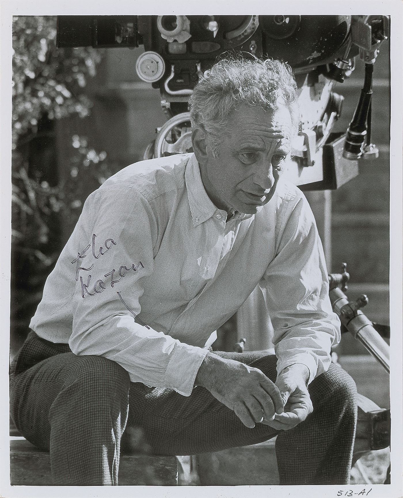 Glossy 8 x 10 seated photo of Kazan in a state of concentration, signed in black felt tip. Reverse bears an affixed photo caption for the 1969 film The Arrangement. In fine condition, with some light crazing to the emulsion. From the Harvey and Rhoda Kuflik Collection.
