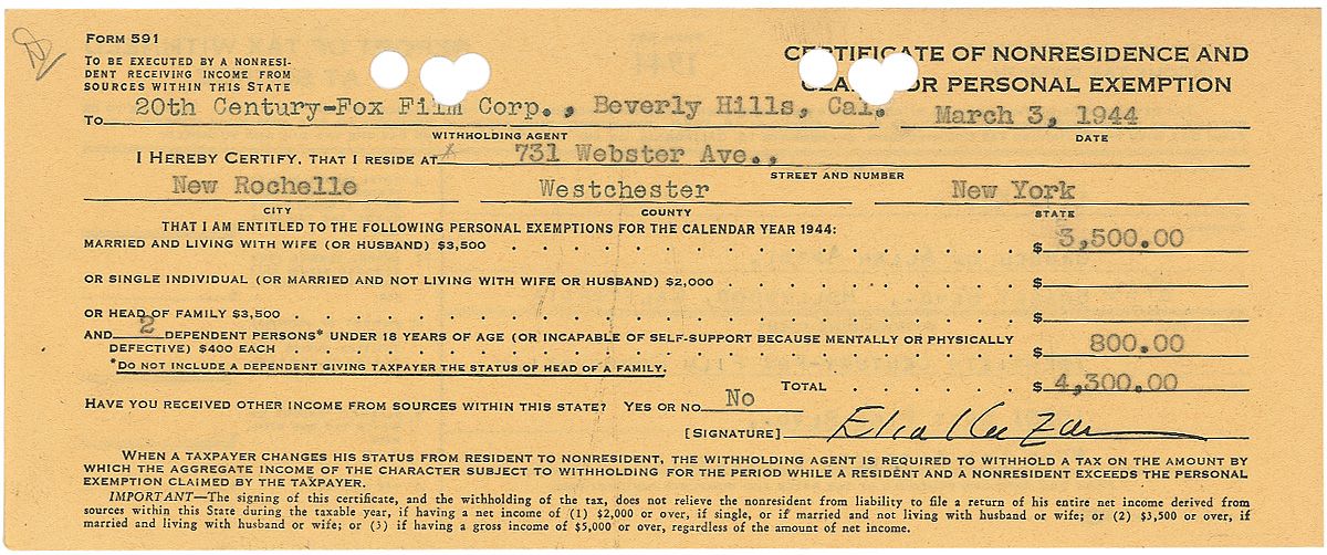 DS, one page, 8.5 x 3.5, March 3, 1944. California non-resident tax exemption form in which Kazan claims a $4300 exemption for the calendar year of 1944, also claiming two dependents. Kazan lists his source of income from 20th Century Fox Film Corporation. In fine condition, with punch holes to top edge, as well as a small pencil notation.