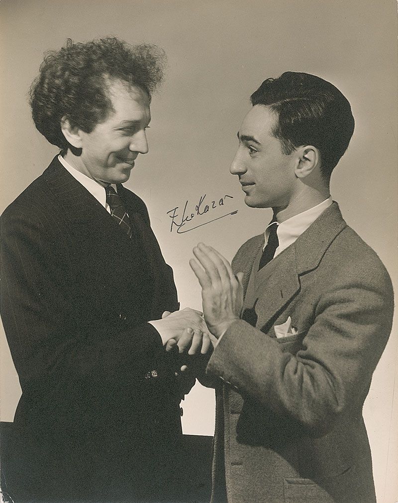 Vintage matte-finish 7.5 x 9.5 photo of Kazan with Sam Jaffe in The Gentle People, signed in fountain pen. Light corner tip dings, otherwise fine condition.