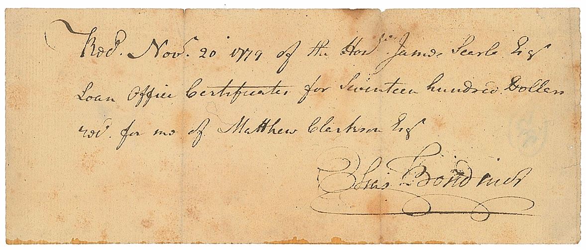 American lawyer and statesman (1740–1821) who served as President of the Continental Congress from 1782 to 1783 and later became a US Representative from New Jersey and director of the United States Mint. Revolutionary War–dated ADS, one page, 7.5 x 3, November 20, 1779. Financial receipt, in part: “Recd. Nov. 20 1779 of the Hon. James Searle Esq Loan Office Certificate for Seventeen hundred Dollars.” In very good condition, with intersecting folds and scattered staining. Accompanied by an unsigned engraved portrait bearing a pre-printed facsimile signature.