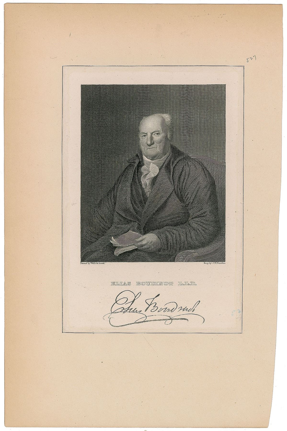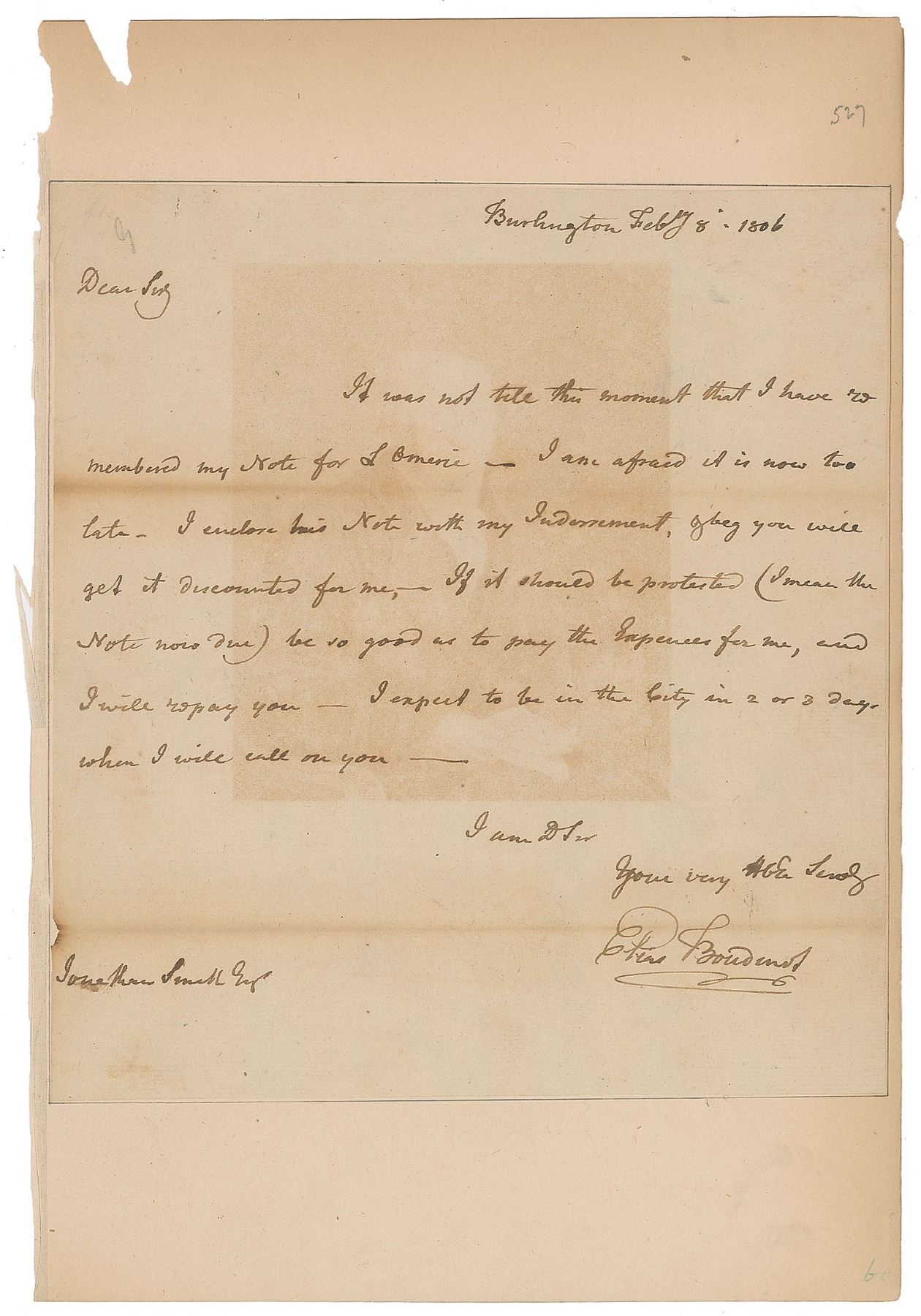 American lawyer and statesman (1740-1821) who served as President of the Continental Congress from 1782 to 1783 and later became a US Representative from New Jersey and director of the United States Mint. Uncommon ALS, one page, 7 x 7.75, February 8, 1806. Letter to Jonathan Small, in part: "It was not till this moment that I have so remembered my Note…I am afraid it is now too late. I enclose this Note with my Indorsement, & beg you will get it discounted for me,—If it should be protected (I mean the Note now due) be so good as to pay the Expenses for me, and I will repay you—I expect to be in the City in 2 or 3 days when I will call you—." Expertly inlaid into a slightly larger sheet. In very good to fine condition, with two horizontal lines of toning, and a ghostly offset image of Boudinot, the result of contact with an engraving of him (included).
