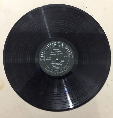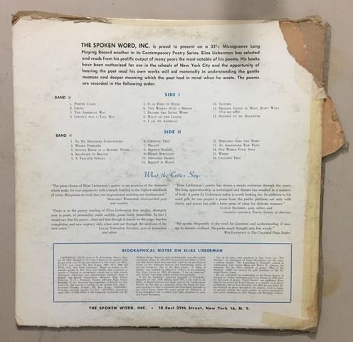Elias Lieberman "Contemporary Poetry Series, (1958) 'The Spoken Word" Vinyl record, autographed by Elias Lieberman on the front cover, various contemporary poets reading from their works, Elias Lieberman headshot on the front album cover.