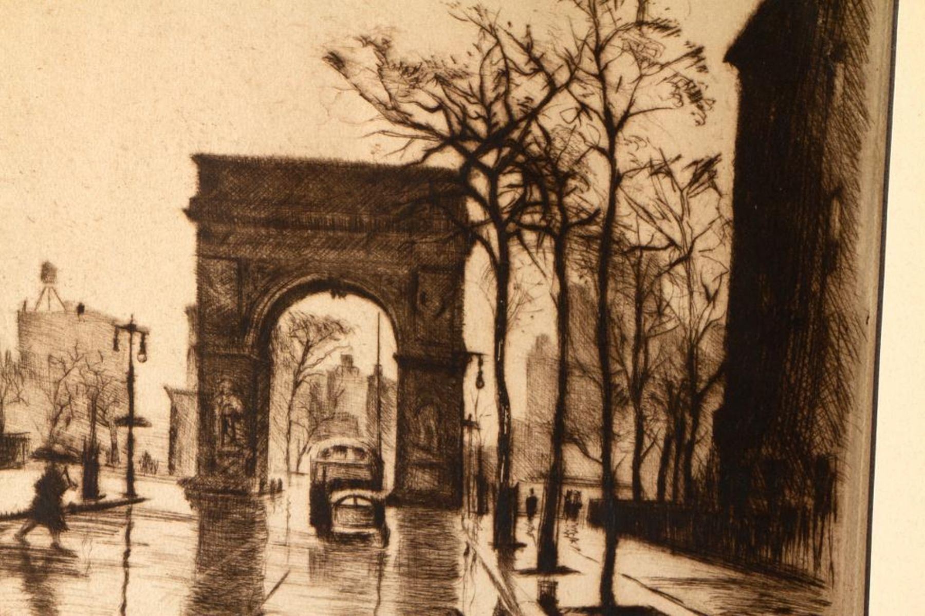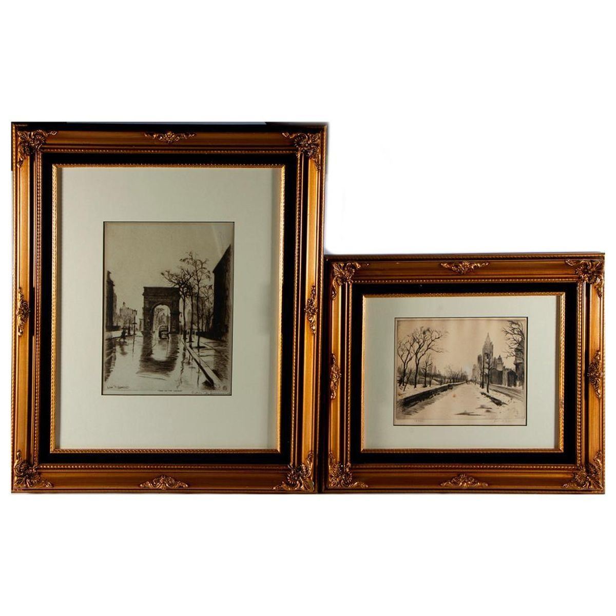 Artist: Elias Mandel Grossman (1898 - 1947). Title/Subject: "Winter Scene" and "Rain on the Square". Signature: Lower right. Medium: Etchings. Size frame: 21" H x 25 1/2" W and 16 1/2" H x 19 1/2" W. Size image: 19 1/2 " H x 15 1/2" W and 7" H x 9" W. Date created: Early 20th century. Condition: Good, slight foxing to "Winter".