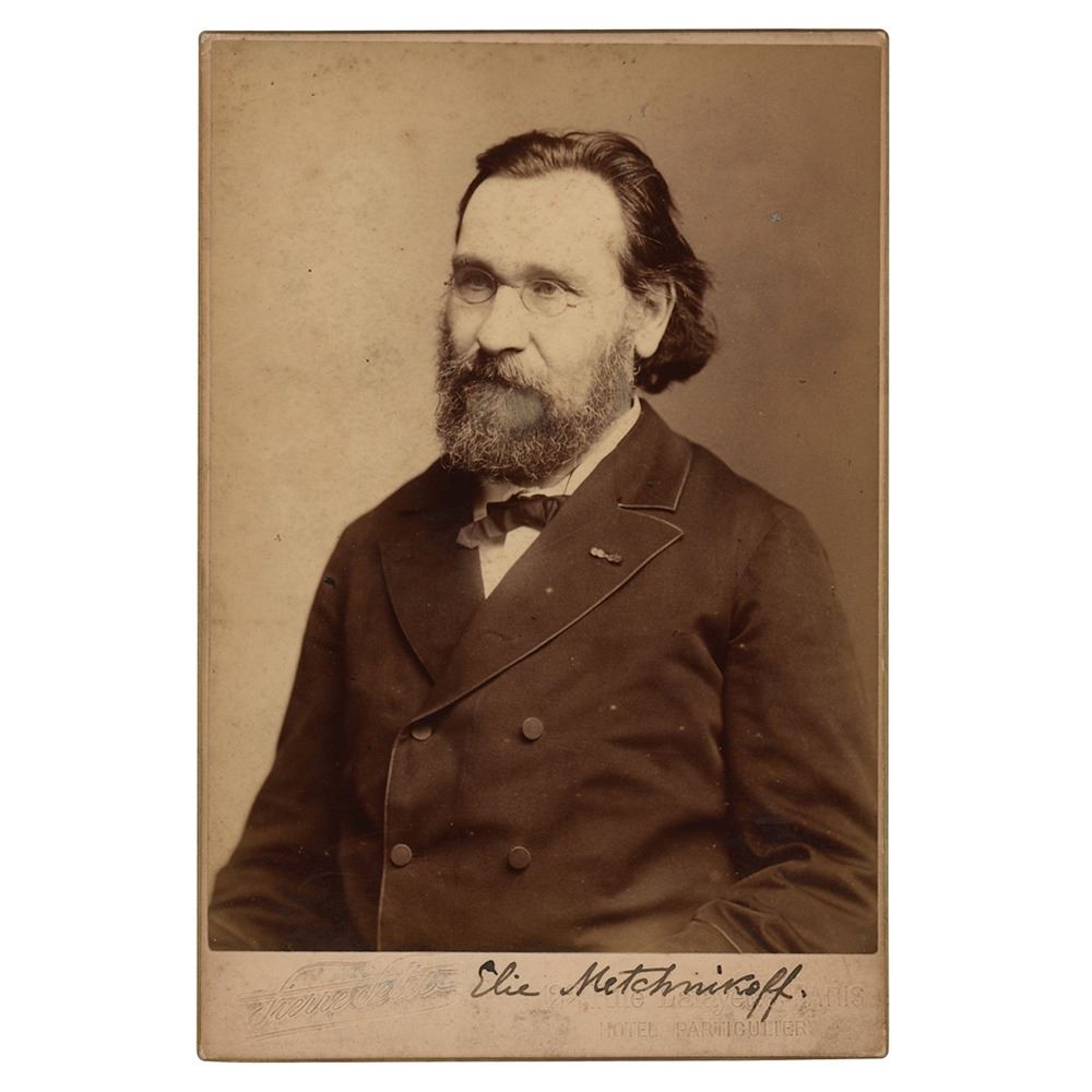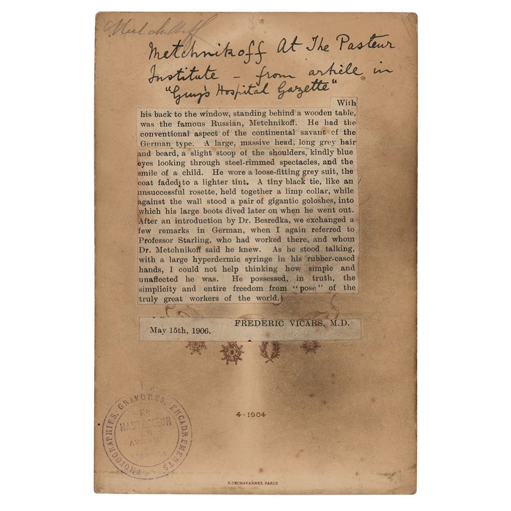 Russian biologist and zoologist (1845-1916) best known for his pioneering research into the immune system for which he, with Paul Ehrlich, was awarded the 1908 Nobel Prize in Physiology or Medicine. Rare 4.25 x 6.5 cabinet photo of the pioneering immunology researcher by Pierre Petit of Paris, nicely signed on the mount in ink, "Elie Metchnikoff." Reverse is annotated in an unknown hand and bears an affixed newspaper clipping describing the famous Russian scientist. In fine condition, with light scuffing and silvering. Signed photographs of Metchnikoff are exceedingly rare—this is just the second we have offered.
