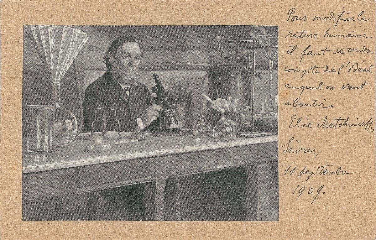 Russian biologist and zoologist (1845–1916) best known for his pioneering research into the immune system for which he was awarded the 1908 Nobel Prize in Physiology or Medicine. Scarce AQS in French on an off-white 5.5 x 3.5 card bearing an affixed image of Metchnikoff in his lab, signed, “Elie Metchnikoff, Sevres, 11 Septembre 1909.” Metchnikoff pens a quote on human nature, in full (translated): "In order to modify human nature, it is necessary to realize what is the ideal to which we have to go.” In fine condition.