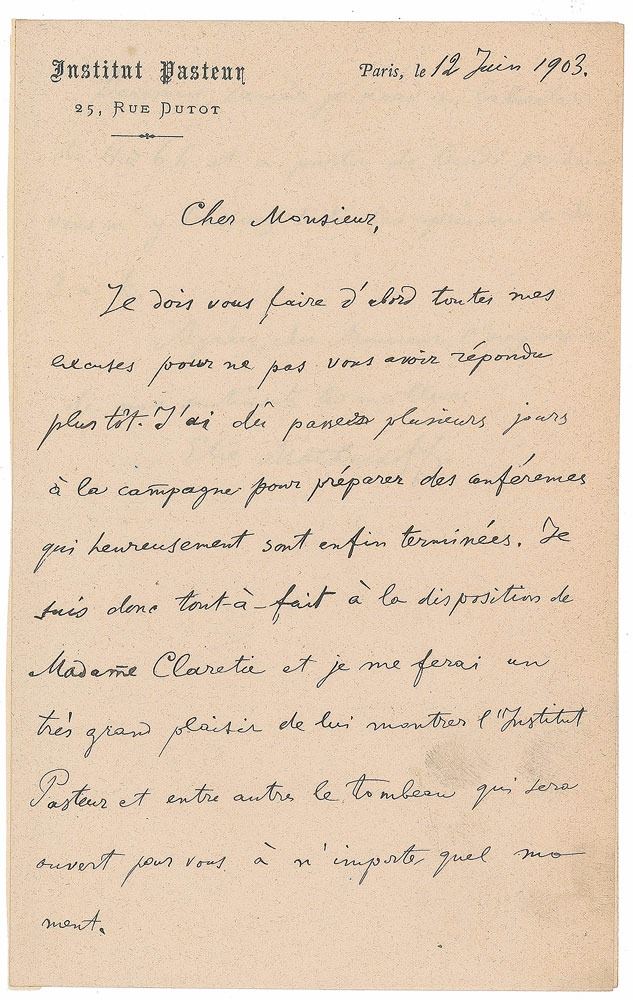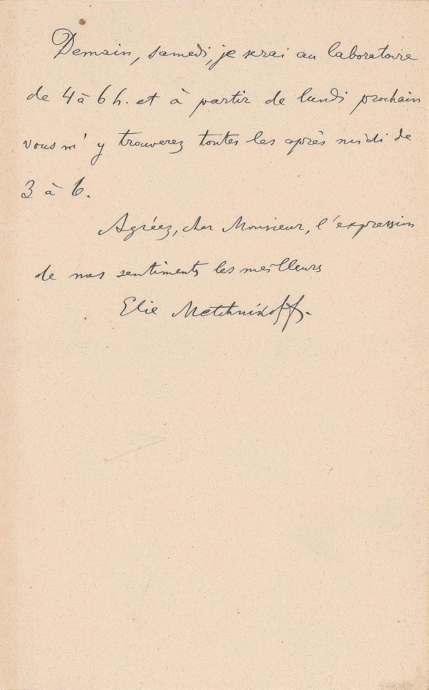 Russian biologist and zoologist (1845-1916) best known for his pioneering research into the immune system for which he was awarded the 1908 Nobel Prize in Physiology or Medicine. ALS in French, two pages on two adjoining sheets, 4.5 x 7, Institut Pasteur letterhead, June 12, 1903. In part (translated): "I have to apologize for not having responded to you earlier. I had to spend many days in the country having prepared for the conference that has fortunately finally ended. I am therefore entirely at the disposal of Mrs. Claretie and I will be very pleased to show her the Institute Pasteur and among other things the tomb that will be opened for you at any time. Tomorrow, on Saturday, I will be at the laboratory from 4 to 6 h. and since Monday you can find me every day from 3 to 6." In fine condition.