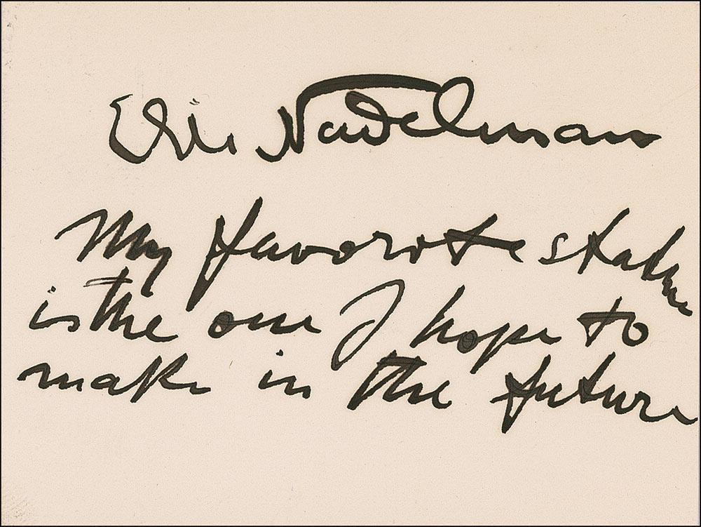 American sculptor (1882-1946). AQS on an off-white 3.75 x 3 card. In full: “My favorite statue is the one I hope to make in the future.” Signed along the top by Nadelman. In fine condition. RRAuction COA.