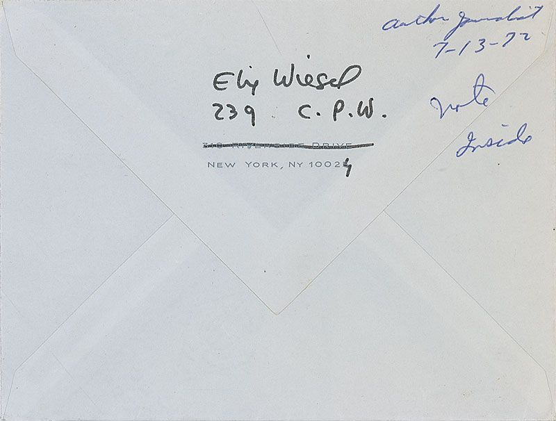 Holocaust survivor, Nobel Peace Prize award-winner, and author (born 1928). ANS, one page, 4 x 5.5, personal letterhead, July 7, 1972. Brief note to an admirer. In full: “What can I say? To you: my warmest wishes—To your son: my greetings.” In fine condition. Accompanied by the original mailing envelope, also signed by Wiesel in the return address area on the flap.