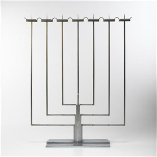 Eliel Saarinen and J. Robert F. Swanson candelabrum Cray USA, 1935/1947 nickel-plated brass 21.25"w x 6"d x 25.5"h Robert F. Swanson, Pipsan Saarinen Swanson, and Eliel Saarinen included this design in their line of furnishings for the modern home for the Swanson Saarinen Group. The form was designed over a decade earlier by Swanson for a custom commission in Michigan. Literature: Cranbrook Art Museum: 100 Treasures, Wittkopp, pg. 108 Provenance: Private collection, Bloomfield Hills