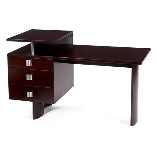 Eliel Saarinen and Pipsan Swanson Saarinen desk, by Johnson Furniture Co., 1940s, birch with dark stain, three drawers with original nickel pulls, unmarked, refinished, 48"w x 20"d x 30"h, veneer cracks to top, minor repairs, good condition