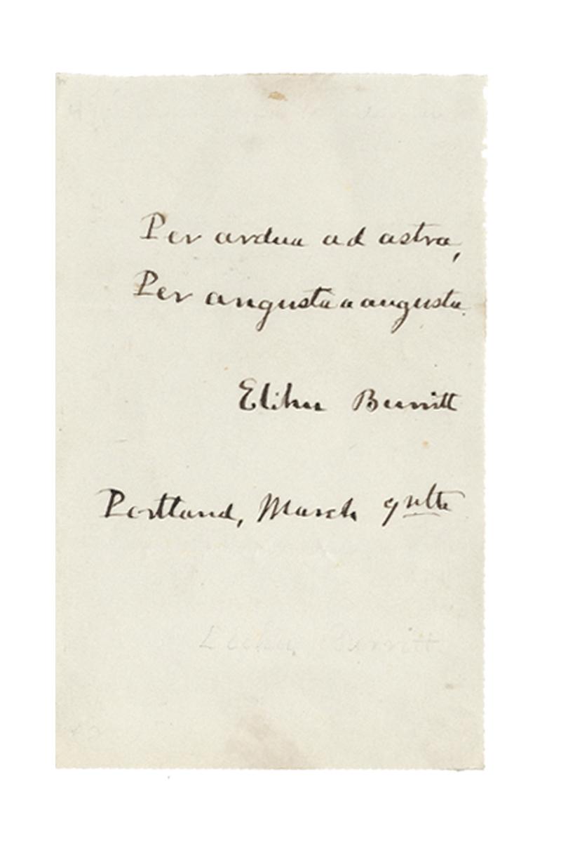 Elihu Burritt (1810 - 1879). American philianthropist and social advocate for international peace. Abolitionist. Portland, March 9th. Autograph Sentiment in Latin signed. “Per aveua ad astra, Per augusta a augusta. Elihu Burritt. Very Fine.