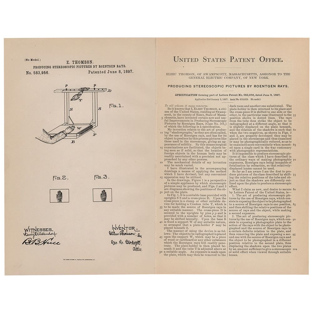 Original patent lithograph for Elihu Thomson's method for "Producing Stereoscopic Pictures by Roentgen Rays" one page, 7 x 10.75, June 8, 1897. The diagram features figures of the device and its "shadowgraph" output, familiarly known as an X-ray today. Marked at the bottom: "The Norris Peters Co., Photo-Litho, Washington, D.C." Includes the printed United States Patent Office specification sheet, two pages on one sheet, which describes the invention as relating to "the art of producing 'shadowgraphs,'" by which "surgical examinations are facilitated, the objects being seen as if solid, so that the location of foreign objects may be readily ascertained with a precision not approached by any other process." In fine condition.