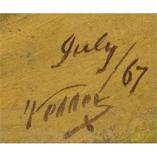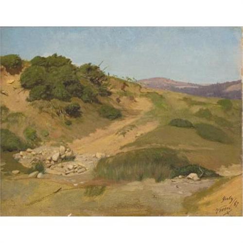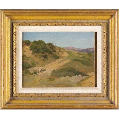 <B>ELIHU VEDDER (American, 1836-1923)</B></I><BR><I>Sand Dunes</B></I>, July 1867<BR>Oil on artist's board laid on board<BR>11-3/4 x 15-1/4 inches (29.8 x 38.7 cm)<BR>Signed and dated lower right: <I>July 67 / Vedder</B></I><BR> <B>Condition Report:</B> Cleaned, minor in-painting in the sky and along the lower edges and corners, scattered strengthening in the vegetation on the upper hillside and in the rocks.<BR><BR><b>Shipping:</b> Requires 3rd Party Shipping (<a target="_blank" href="http://www.heritageauctions.com/common/shipping.php">view shipping information</a>)