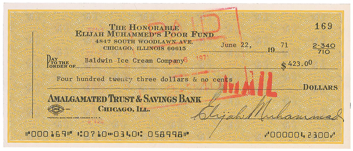 The Honorable Elijah Muhammad’s Poor Fund business check, 7.25 x 3, filled out in type and signed by Muhammad, payable to Baldwin Ice Cream Company for $423.00, June 22, 1971. In fine condition, with expected cancellation stamps and a slight brush to the top of the signature.